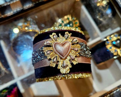 Très belle manchette ExVotoByNaGap intitulée " Nuit Magique" une pièce unique où l’audace rencontre la délicatesse. Son cœur noir pailleté, entouré de rayons dorés et de gouttes bleu profond, capte la lumière et attire tous les regards.