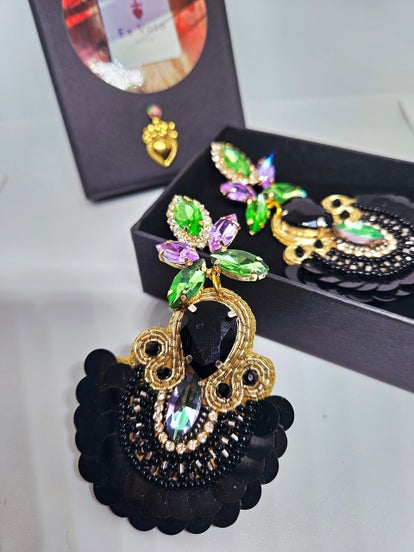 Éclatantes et envoûtantes, elles marient la profondeur du noir irisé à la chaleur de l’or sacré. En leur centre, un cœur flamboyant symbolise la passion et la protection, tandis que les pierres lumineuses et les fleurs délicates rappellent la douceur du divin.