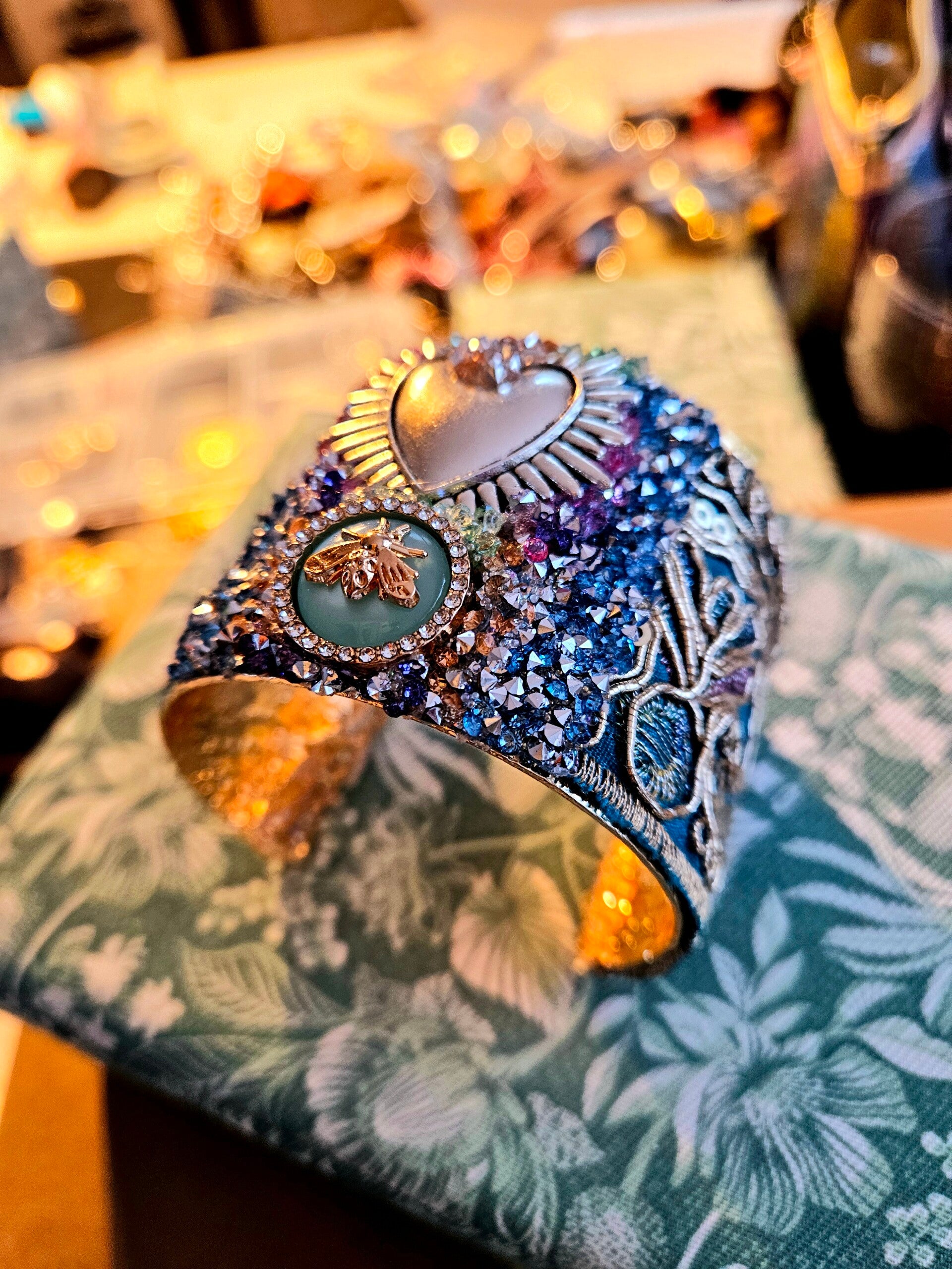 Magnifique manchette Garance , superbe symbole Ex Voto argenté au centre , bracelet doré festonné d' une broderie verte émeraude. Abeille dorée sur fond vert . Création originale, modèle unique