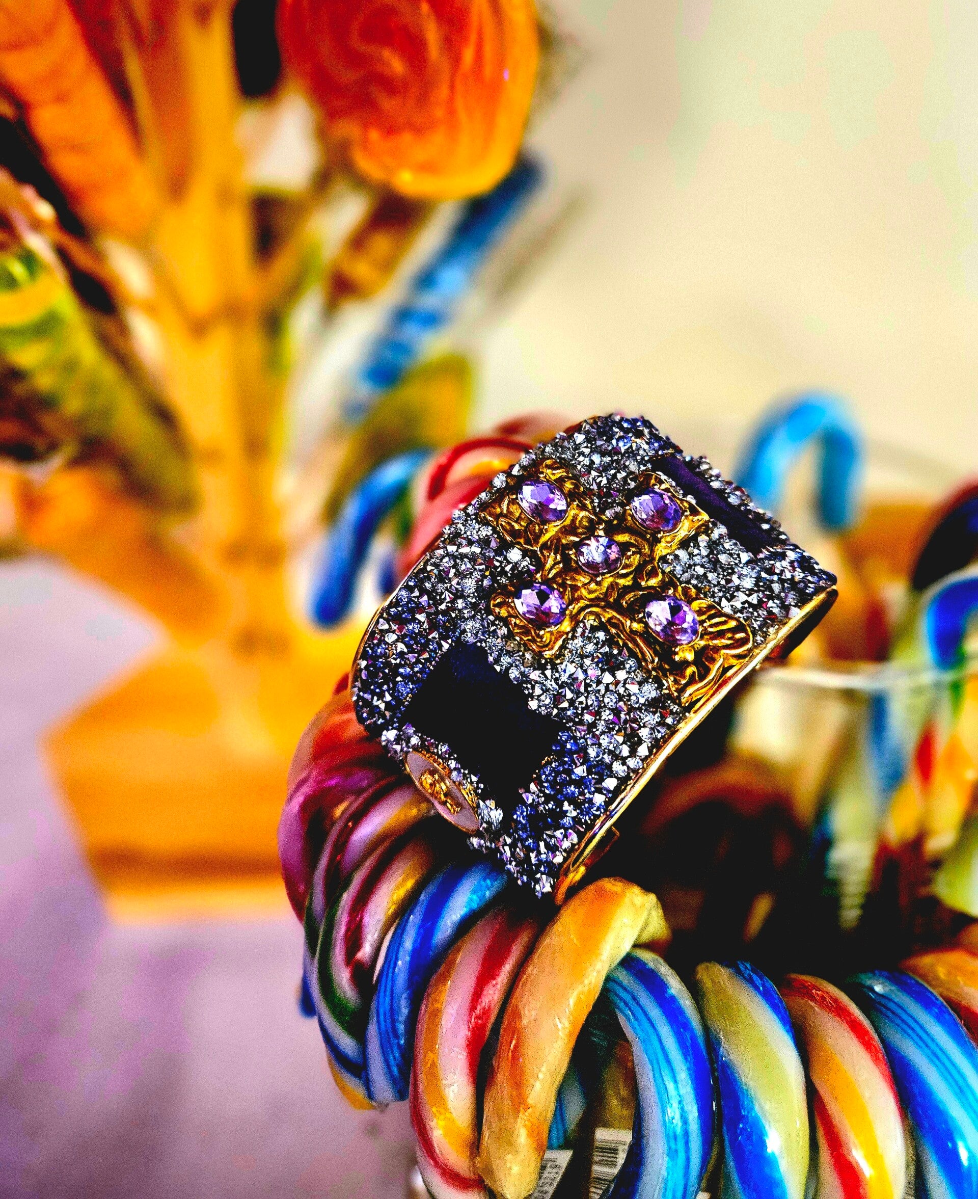 Manchette Fanelie ExVotoByNaGap, bracelet doré, satin violet très lumineux, superbe croix dorée pierres de synthèse.
