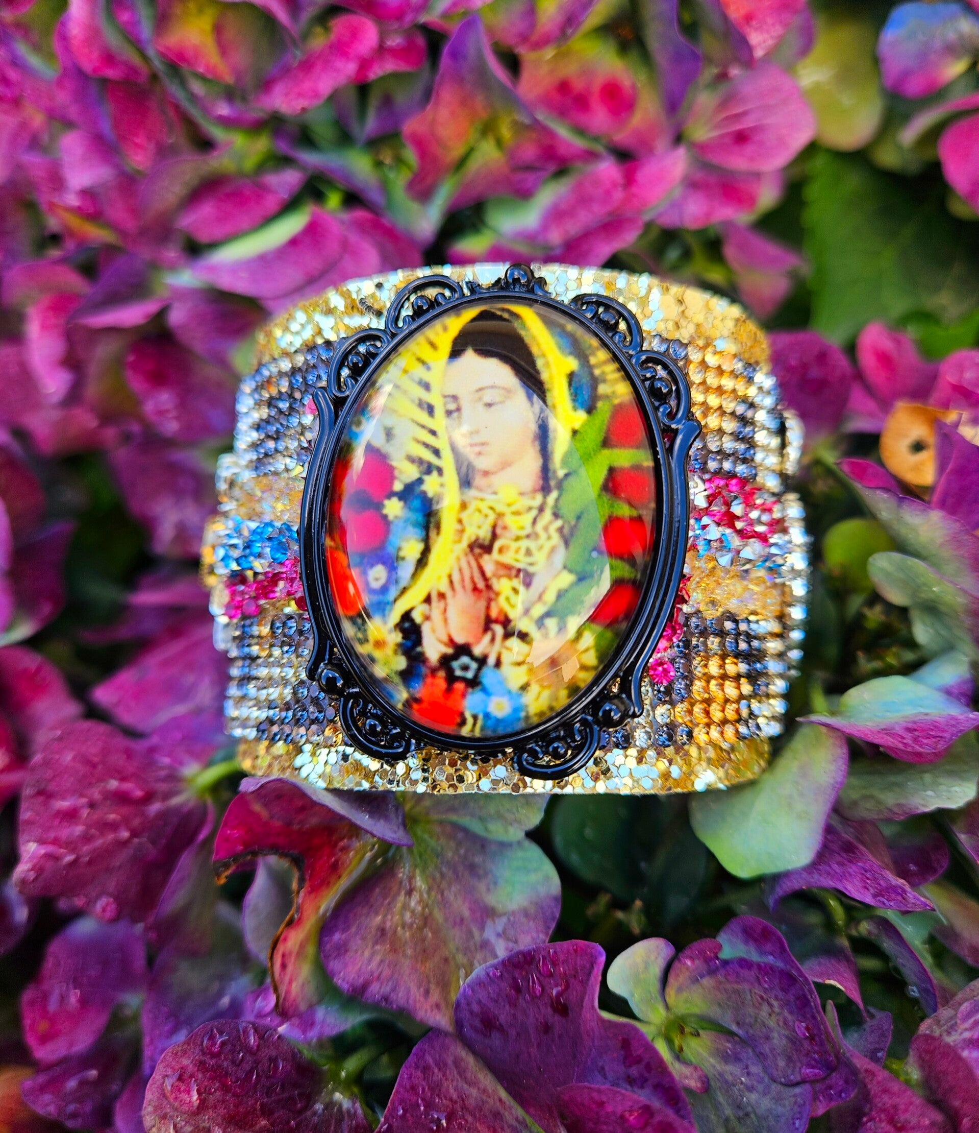 Très belle manchette lumineuse toute en couleur , pièce centrale Madone bombée façon ancien miroir Ex Voto .
