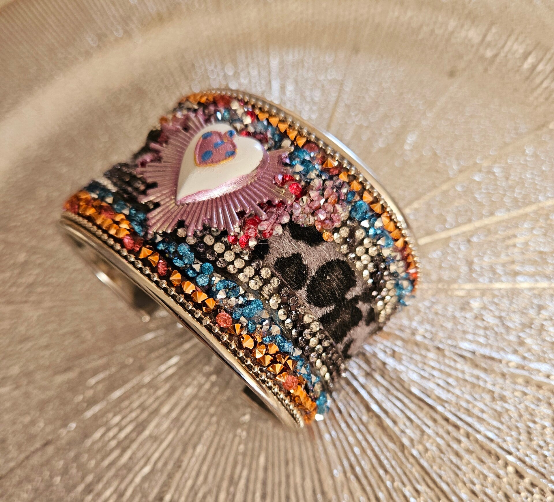 Manchette ExVotoByNaGap " VIC" bracelet doré Ex Voto central argenté peint à la main , blanc émaillé. Tons roses , bleus , imprimé animal.