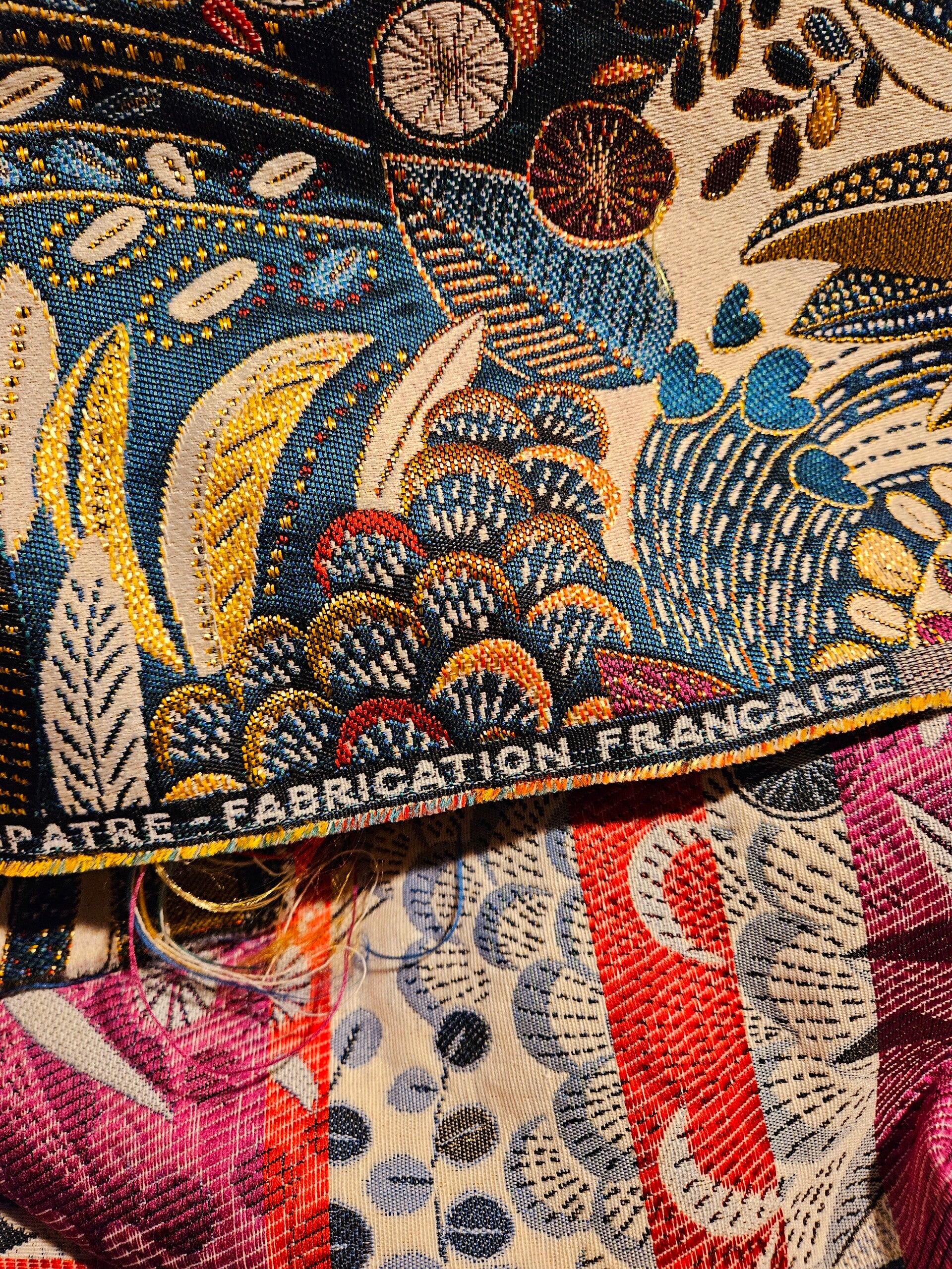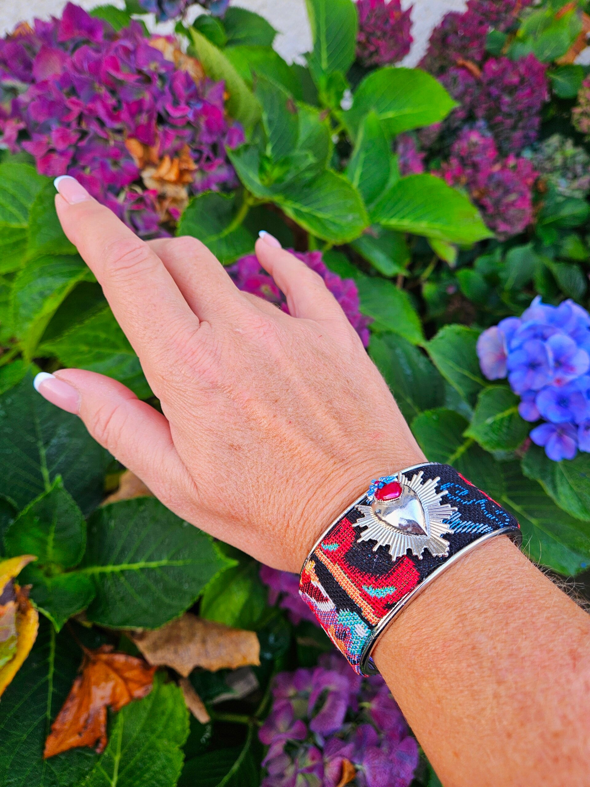 Manchette Chimère ExVotoByNaGap, bracelet argenté très beau jacquard français, Ex voto central argenté rehaussé de strass aux reflets lumineux , pièce unique entièrement réalisée à la main dans mon atelier près de Roussillon.