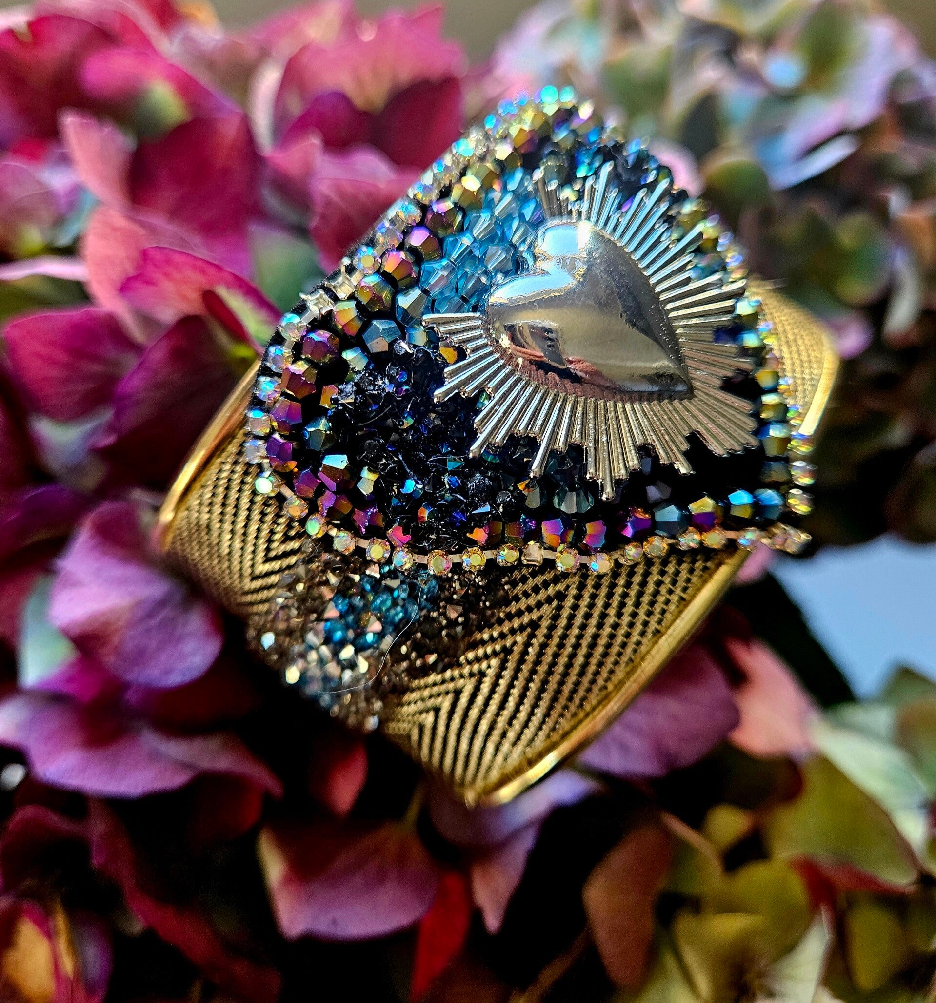 Manchette Elina ExVotoByNaGap, bracelet doré orné d' un ruban or et noir texturé, très belle pièce centrale avec Ex Voto argenté forme cœur sacré, perles de rocailles aux reflets scintillants tons rose bleu nuit or ...vraiment superbe, probablement l' une de mes plus belles créations ! Je vais la produire exceptionnellement en 5 exemplaires.