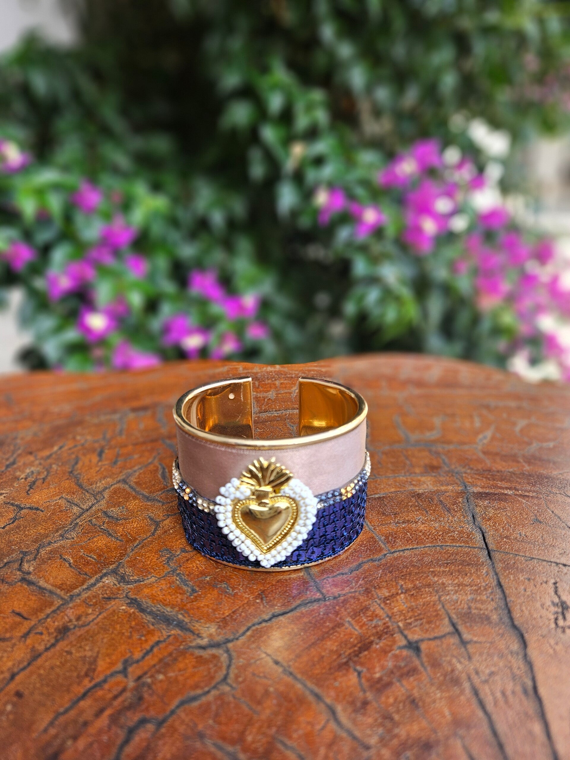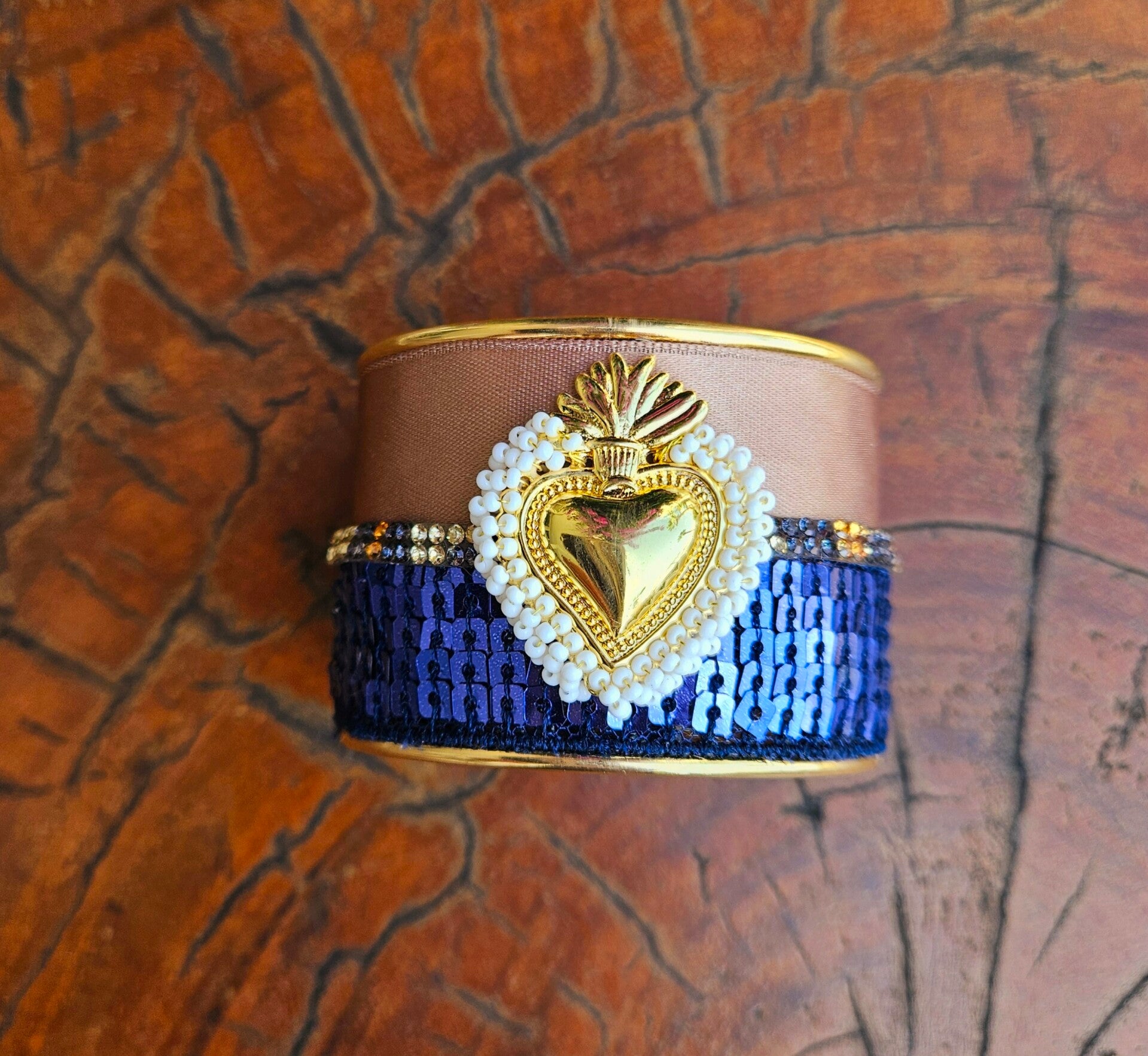 Manchette Corazón ExVotoByNaGap, bracelet doré rehaussé d un satin marron glacé et mis en valeur par un ruban sequin bleu marine , très bel ex voto coeur doré avec perles rocailles blanches