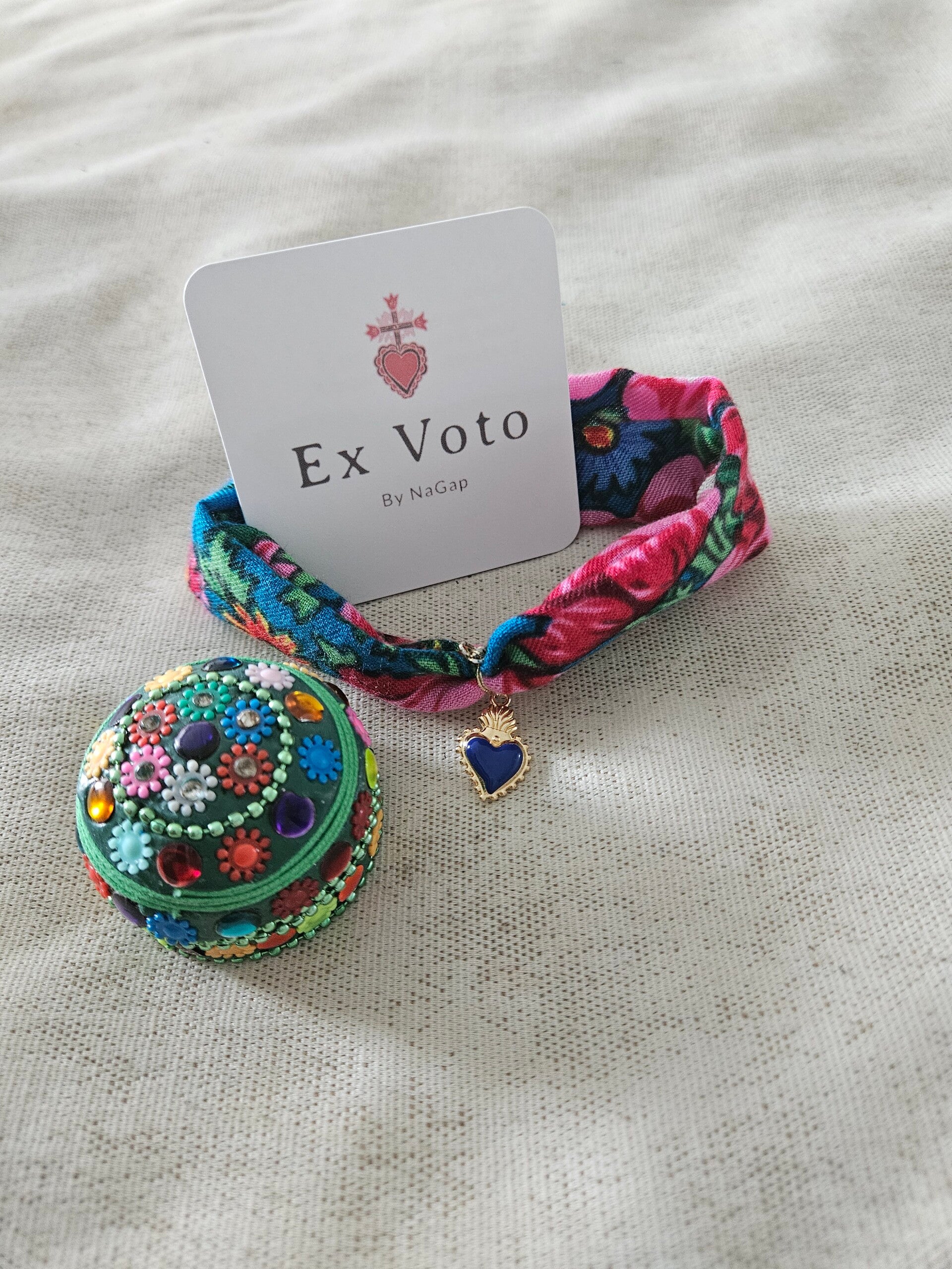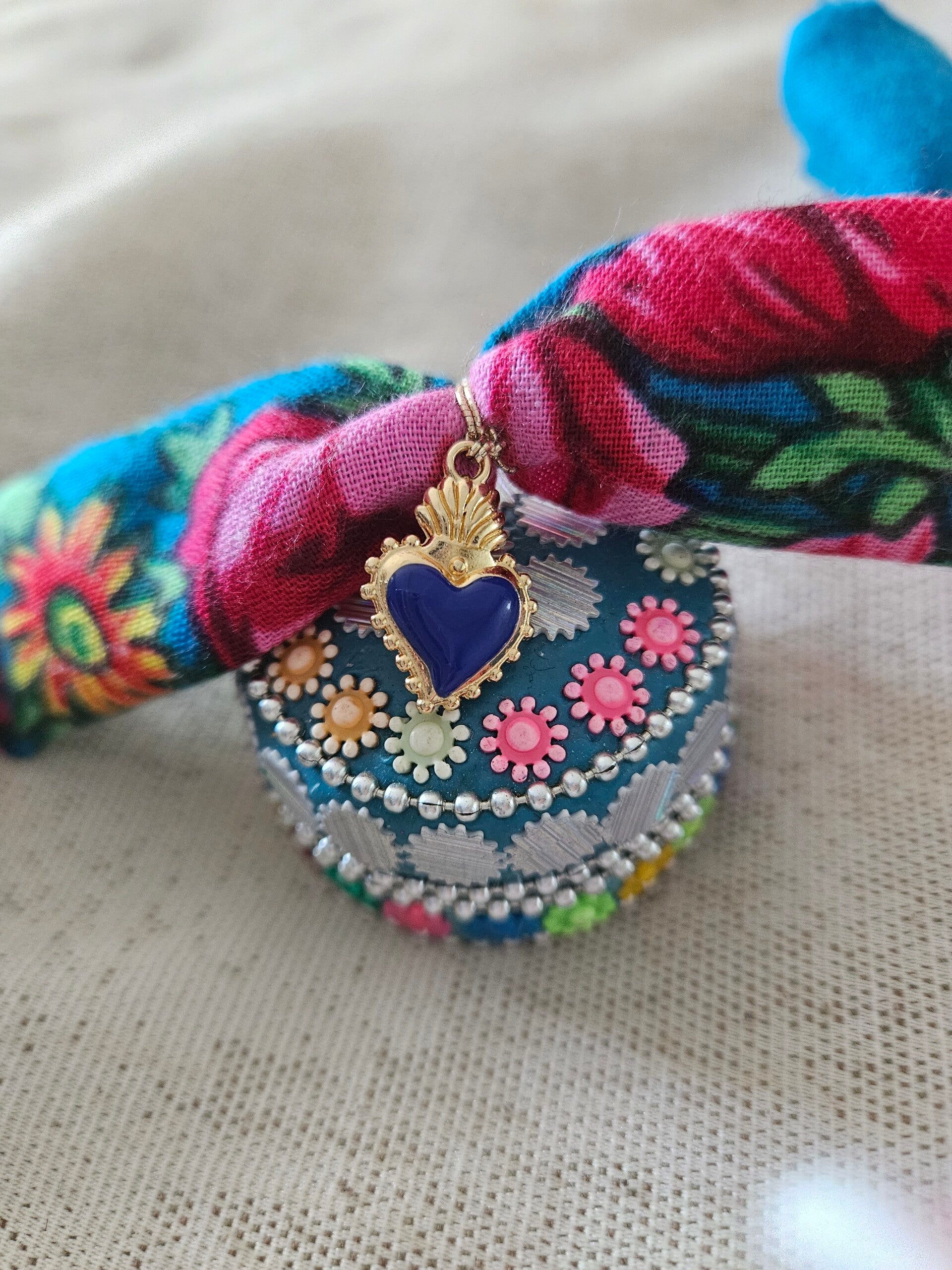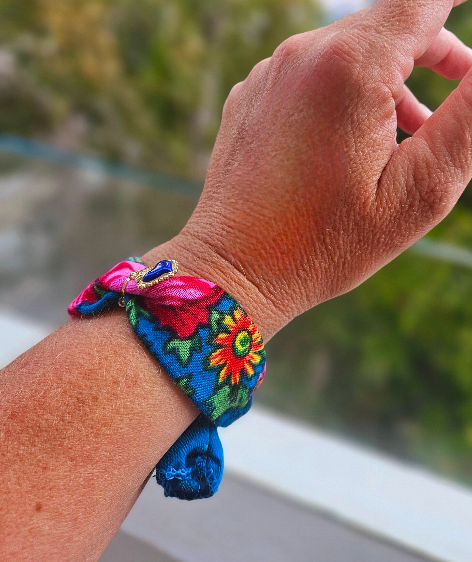 Bracelet en tissu NOUR ExVotoByNaGap, à nouer autour du poignet , du cou ou des cheveux , Ex Voto coeur faïencé mis en valeur par un très beau tissu traditionnel tunisien.