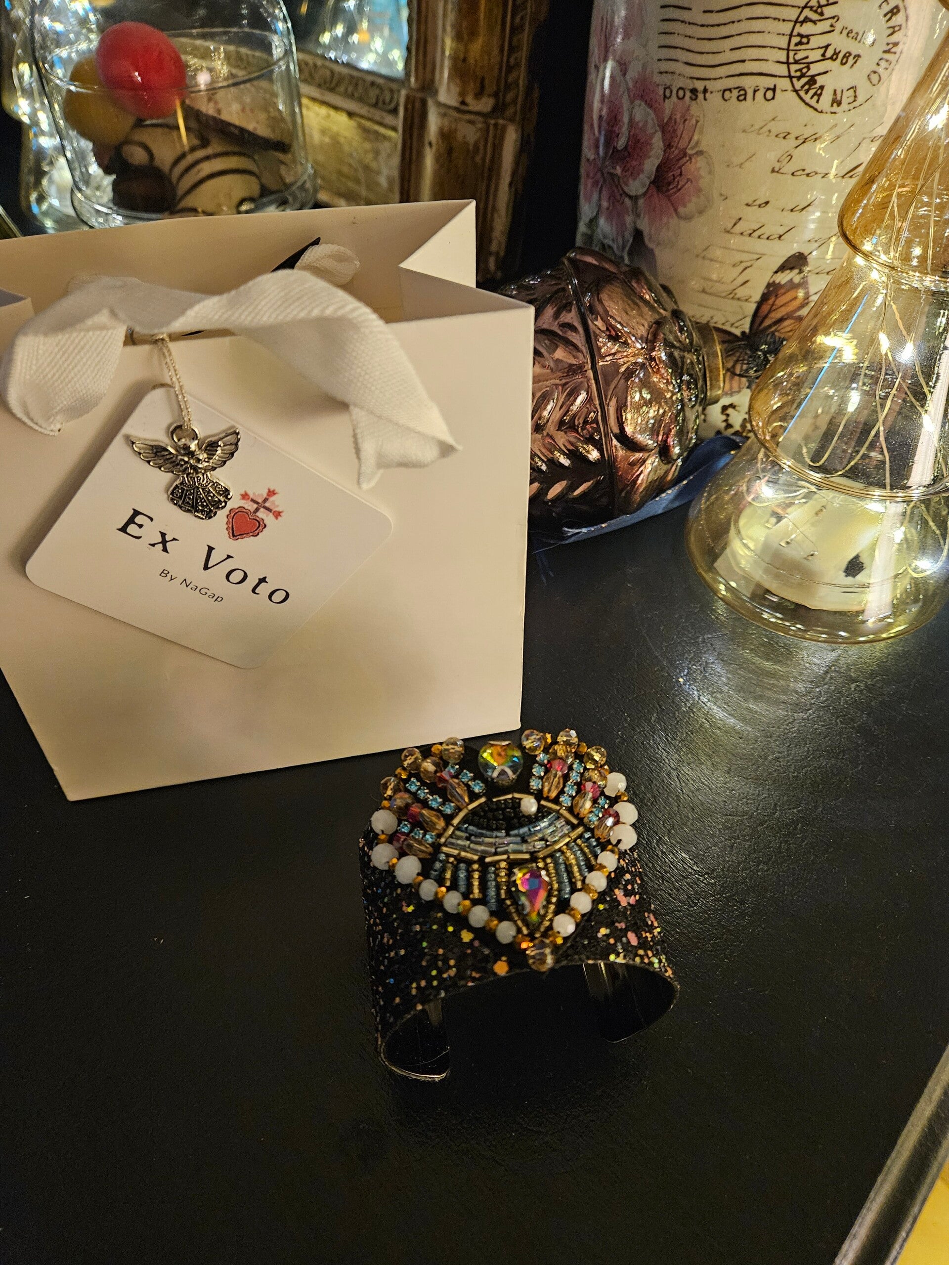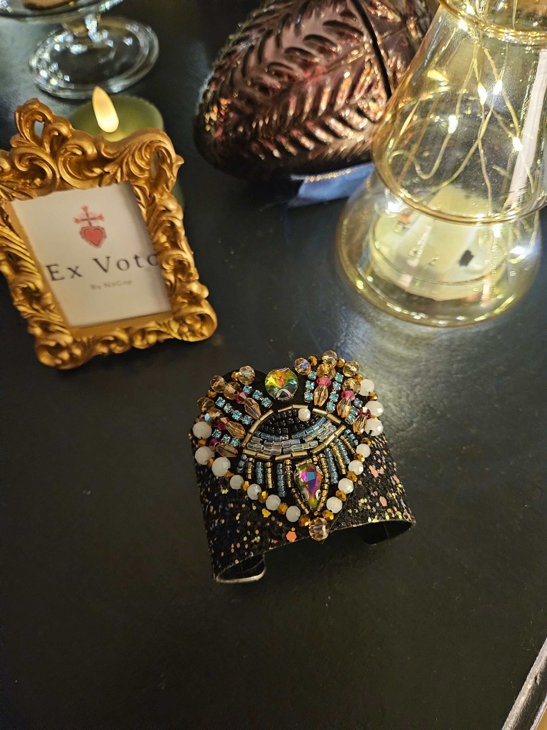 Manchette Nej ExVotoByNaGap, bracelet noir pétrole pailleté avec superbe appliqué coeur protecteur, très lumineux.