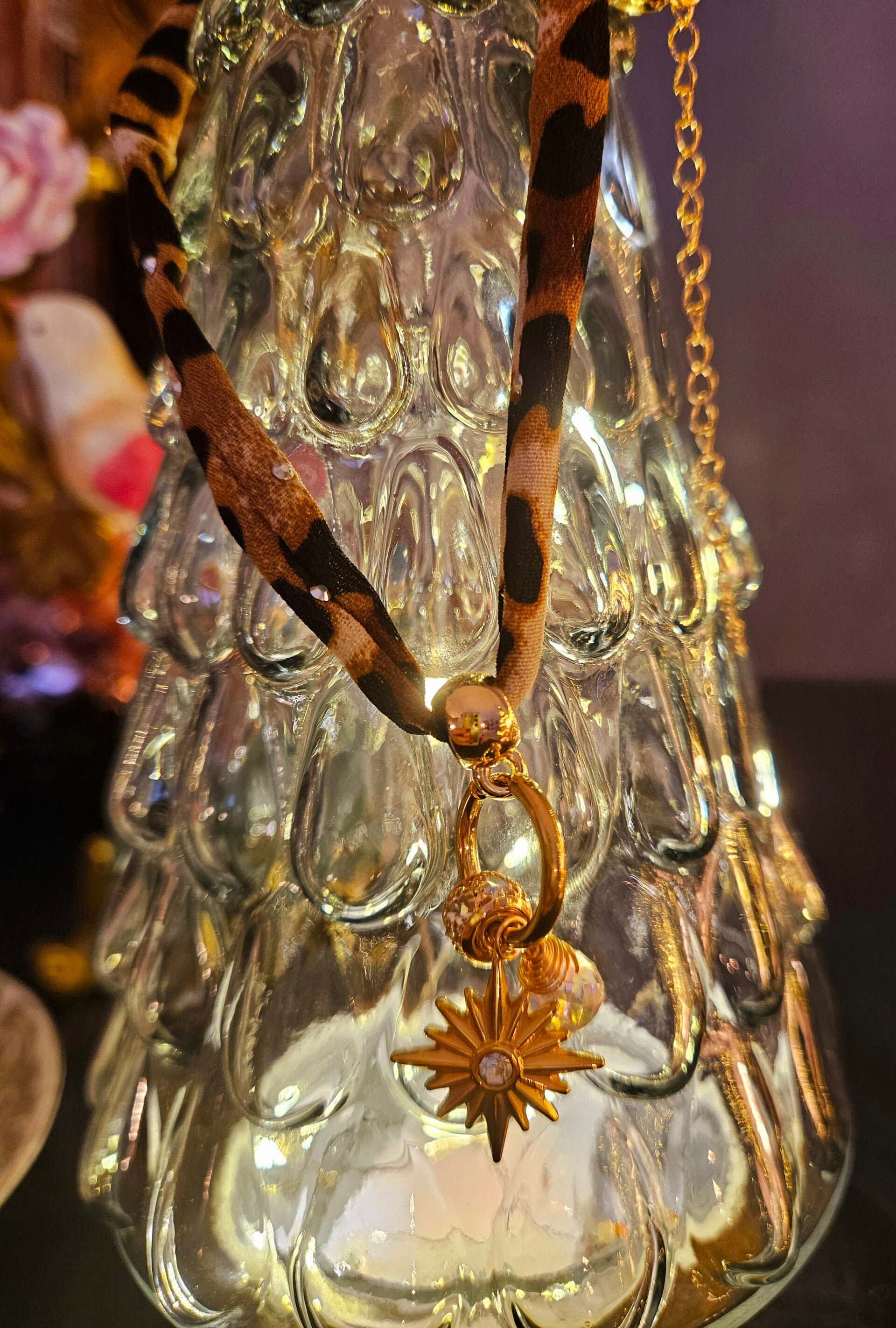 Collier Nagap ExVotoByNaGap, cordon satinée imprimé panthère , pendentif étoile polaire , pampille goutte facettée reflets violets parmes, petit anneau doré et strassé blanc , un collier très élégant qui peut se porter en raz de cou ou plus long.