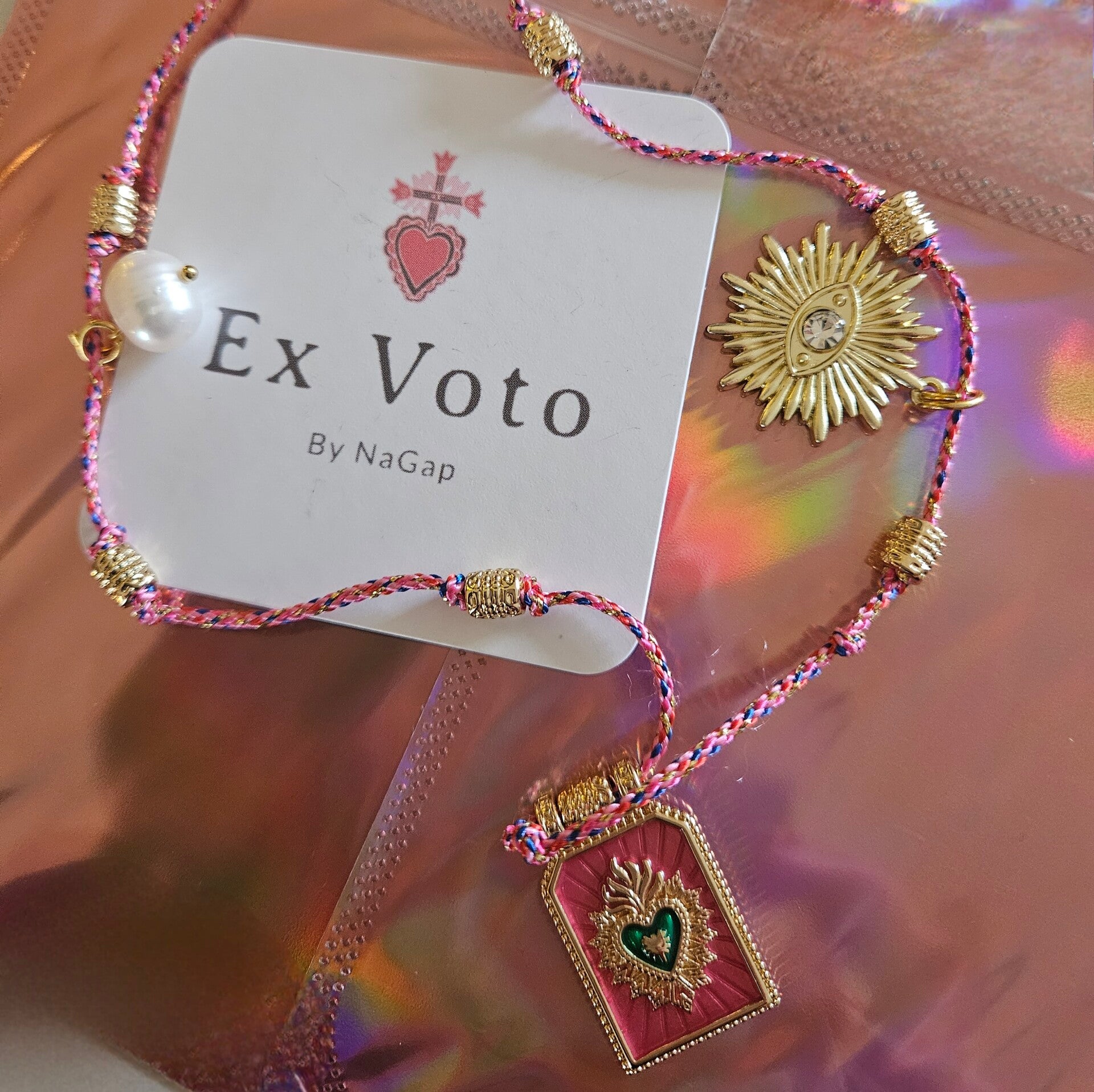 Collier carte Ex voto rose création originale ExVotoByNaGap, lien rose bleu et or rehaussé par des perles dorées , très bel carte Ex Voto coeur sacre central faïencé doré vert et rose , œil protecteur doré, perle d' eau douce, entièrement réalisé à la main dans mon atelier près de Roussillon.