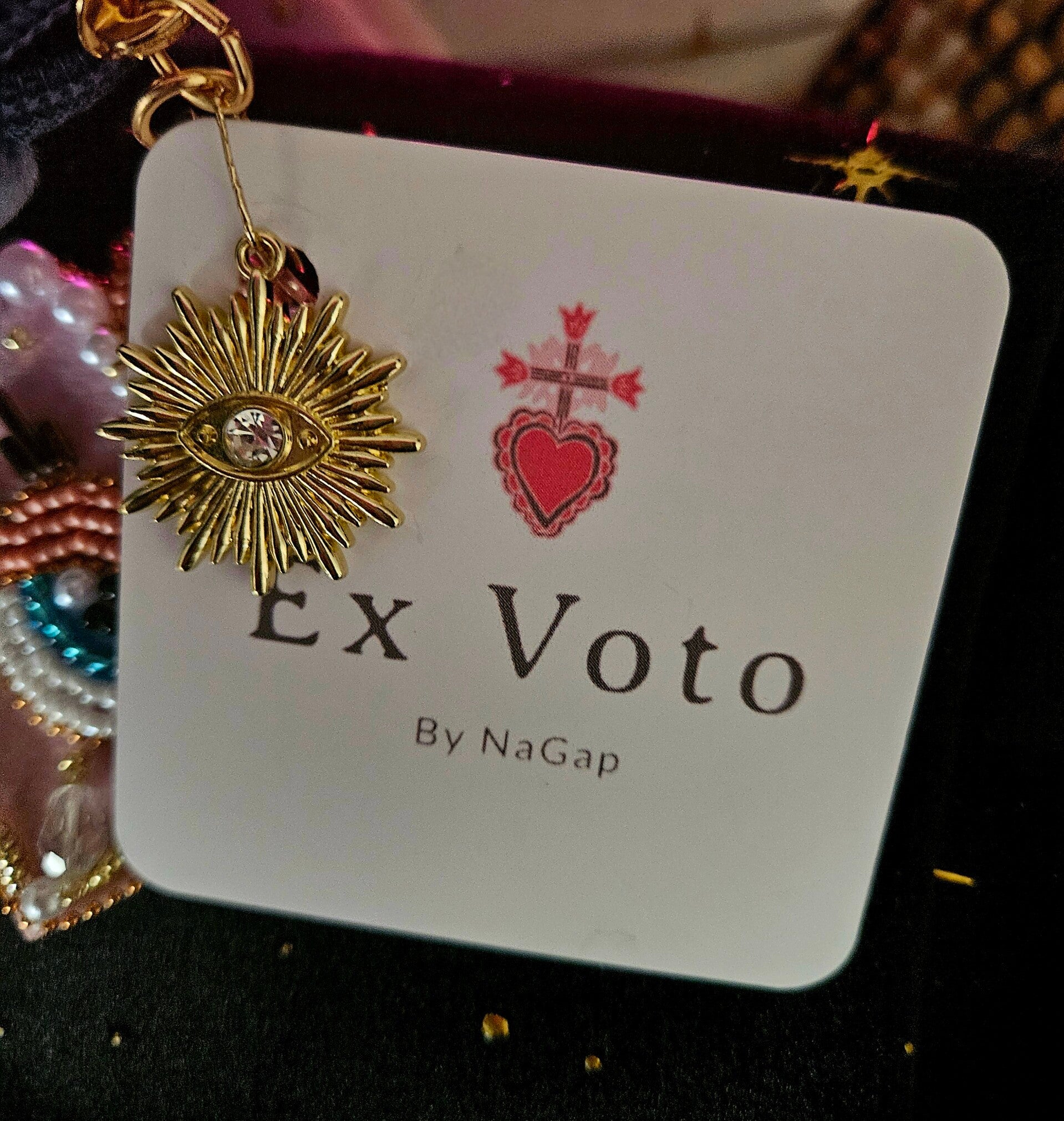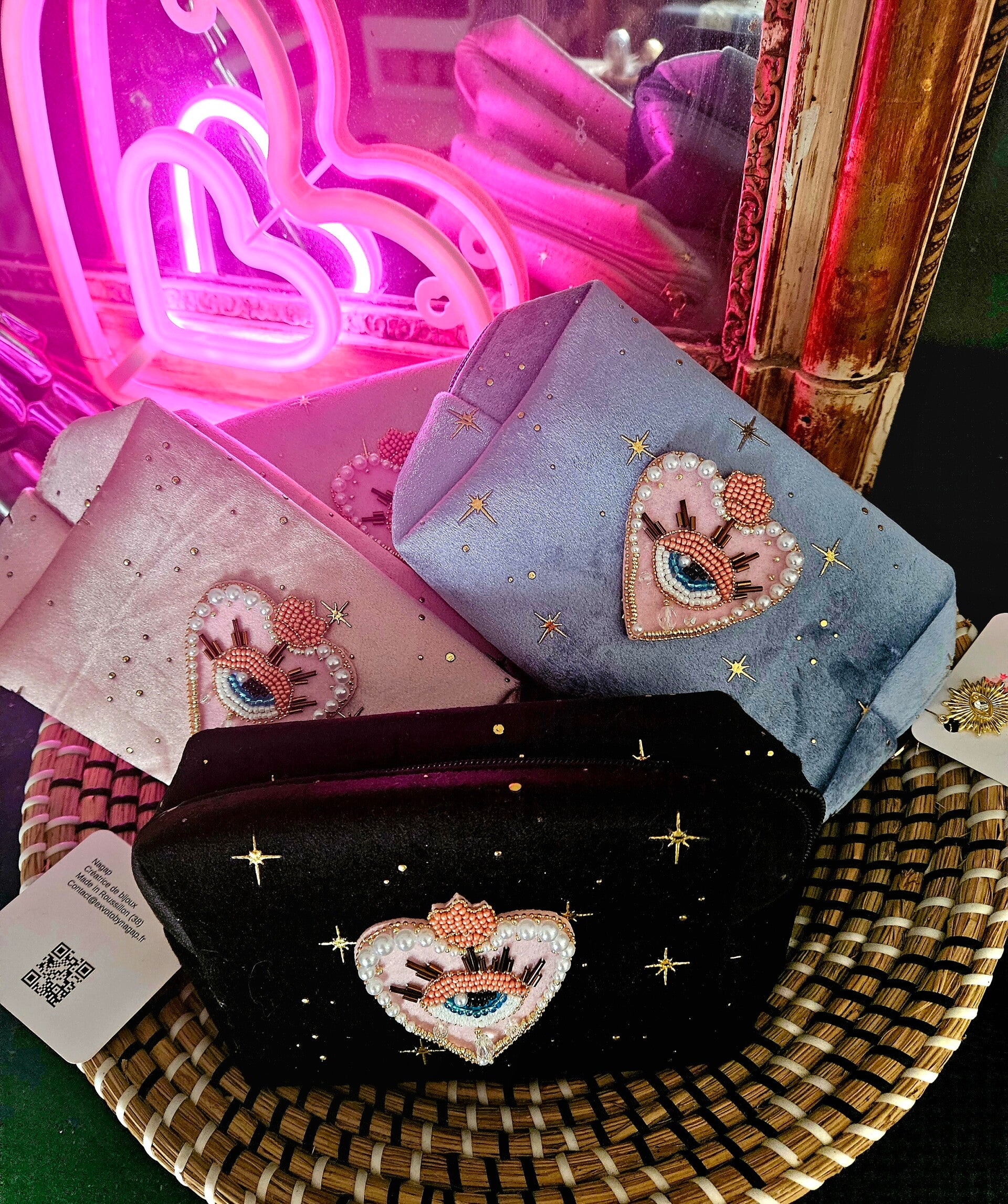 Pochette Eyes en velours ExVotoByNaGap, idéale pour chouchouter vos bijoux et accessoires , doublure imperméabilisée qui permet d accueillir aussi vos cosmétiques , superbe cœur oeil protecteur rose central, 4 coloris , dimensions 22 ×15 environ. Breloque carte et sac cadeau offert .