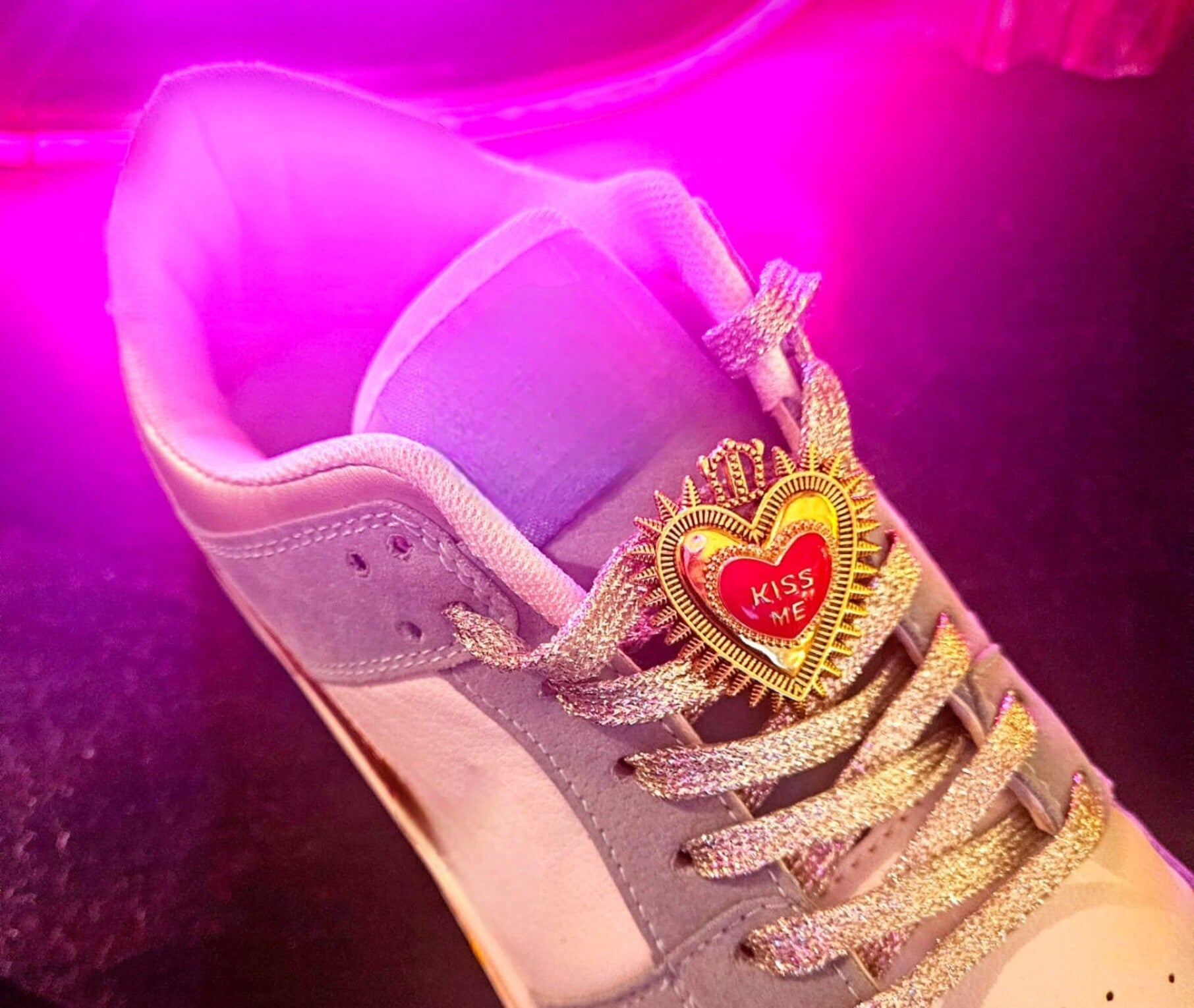 Bijoux de baskets Kiss me ExVotoByNaGap, Ex voto acier inoxydable monté façon pin' s , il peut sublimer vos lacets ou être porté en broche . Vendu avec une paire de lacet , 2 coloris au choix doré/ argenté.