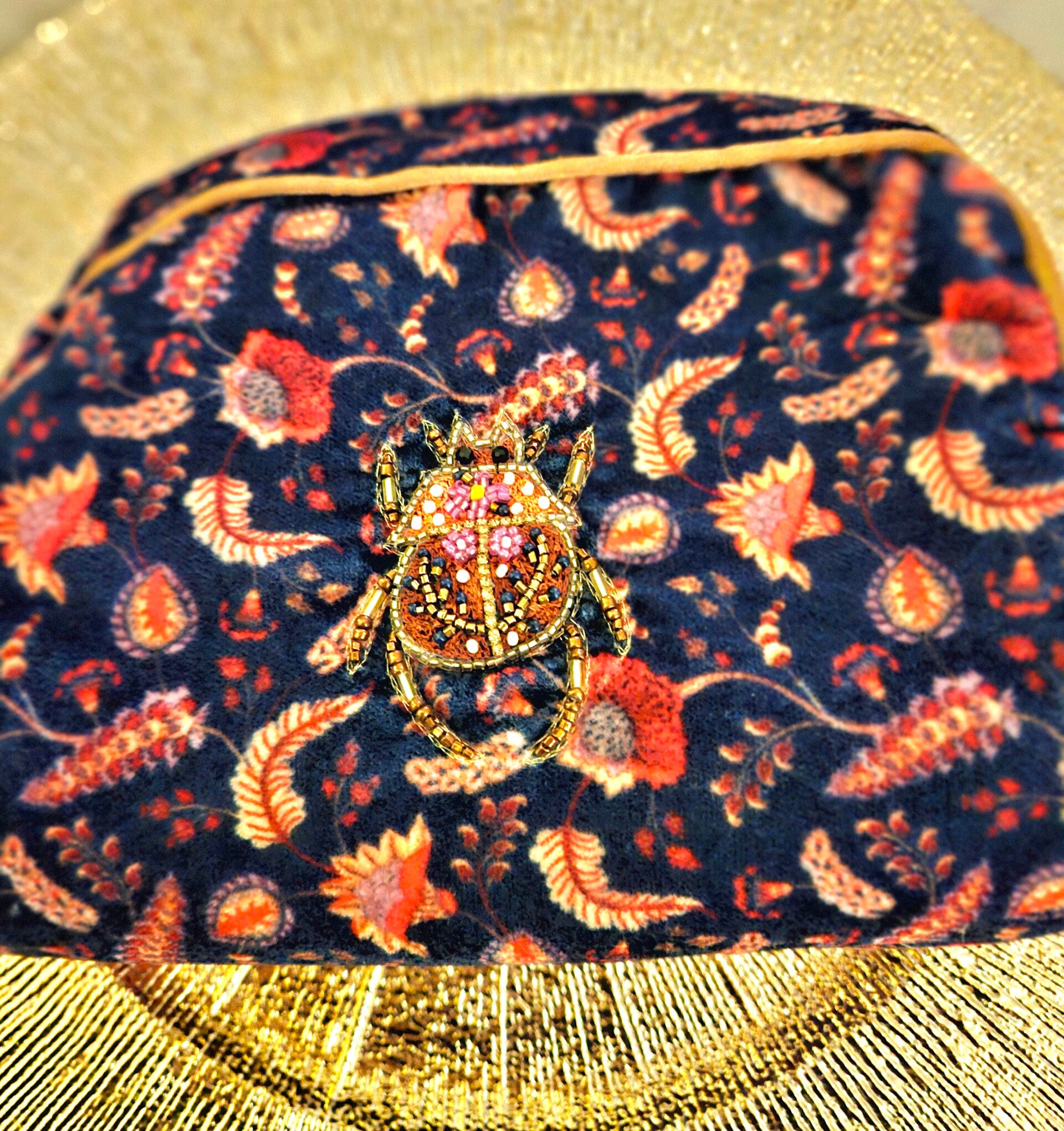 Très belle pochette My Doris en velours avec scarabée orangé/ or/ rouge entièrement réalisé à la main . Dimensions env 20 sur 19 cm. Livrée avec sac carte de tarot dorée, papier de soie coeur et breloque Ex voto.