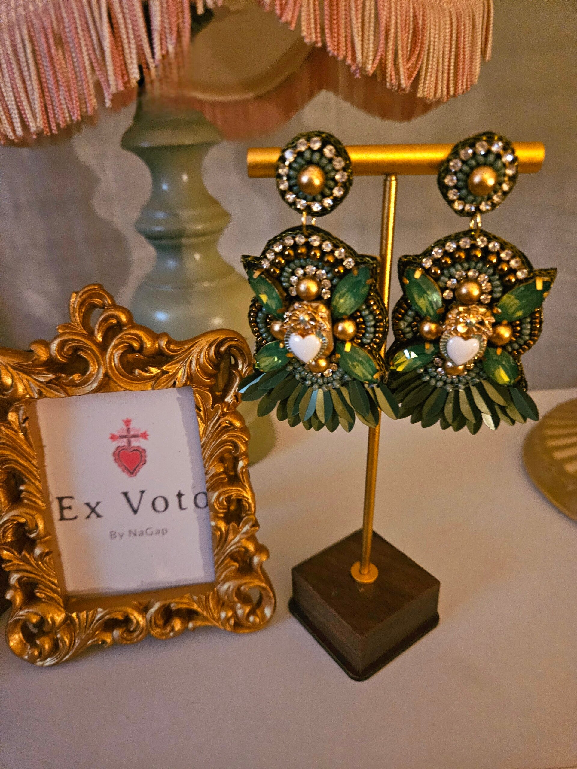 Boucles d' oreille Indira , boucles aux suoerbes reflets verts , travaillée avec un Ex voto central blanc peint à la main , hauteur 7 cm , édition limitée , coloris vert