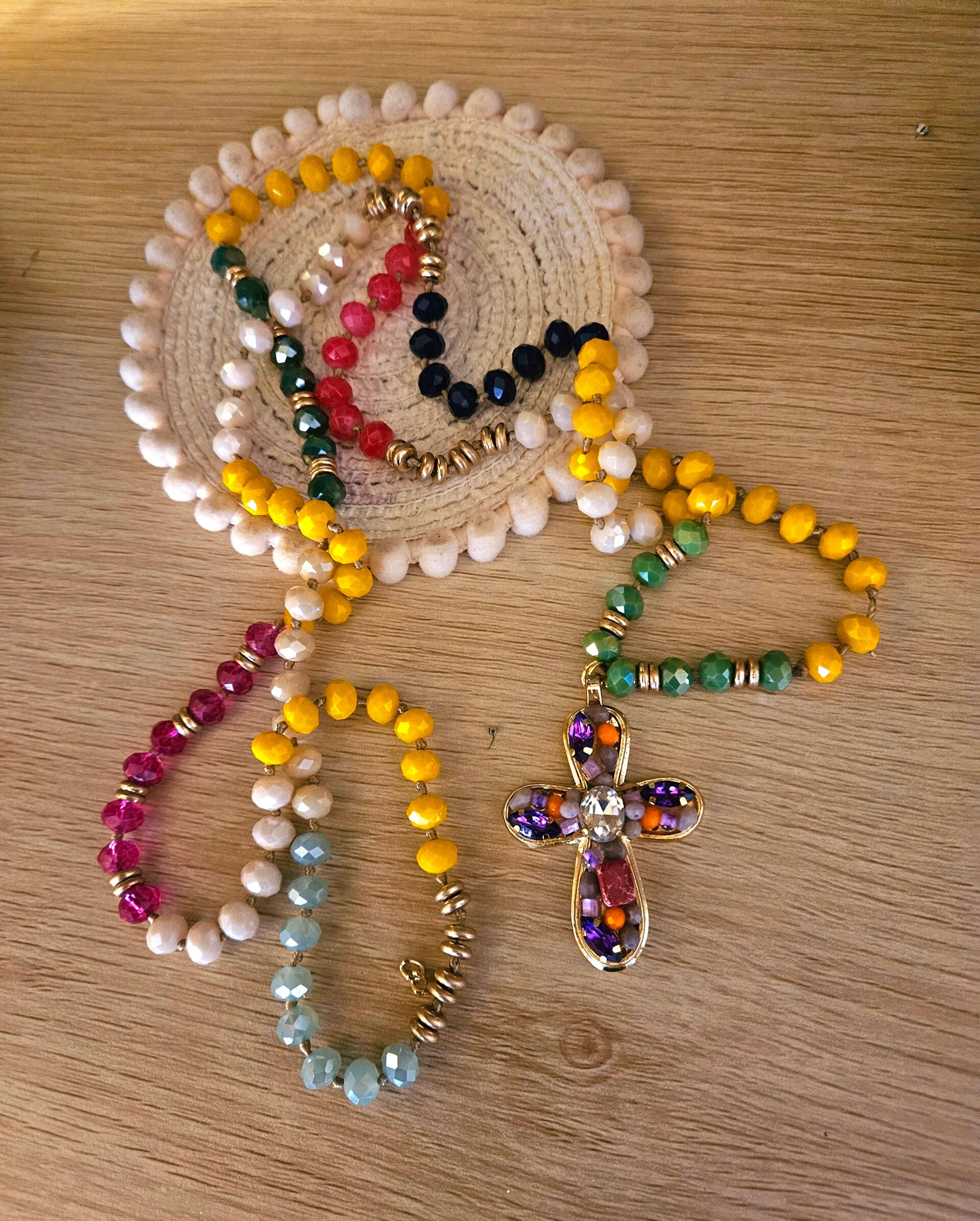 Sautoir color Pearl ExVotoByNaGap, très coloré ce sautoir d un mètre de long est mis en valeur par une superbe croix facettée dans des tons parme violets et oranges, création originale ExVotoByNaGap, édition limitée