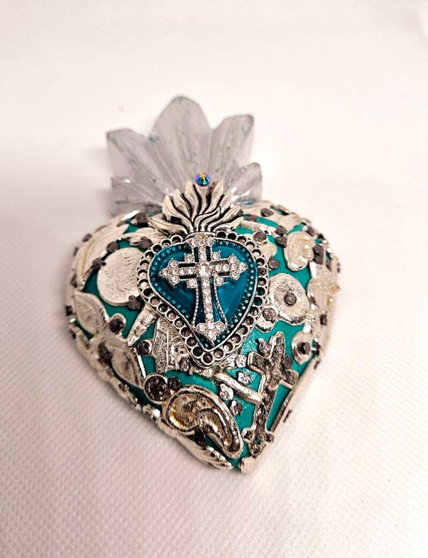 Superbe cœur ex voto tons verts et argent en bois , gris gris en étain cloutés à la main croix travaillée centrale à poser ou à suspendre au mur il est juste sublime ! Dimensions 9×11 cm