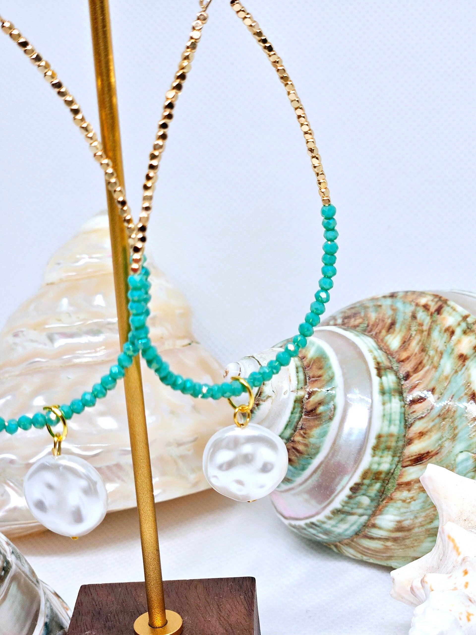 Créoles Claudia , très légères et en toute simplicité, ces créoles sont perlées dans une teinte verte pâle et mises en valeur par une perle ronde blanche nacrée, environ 6 cm , création originale ExVotoByNaGap.