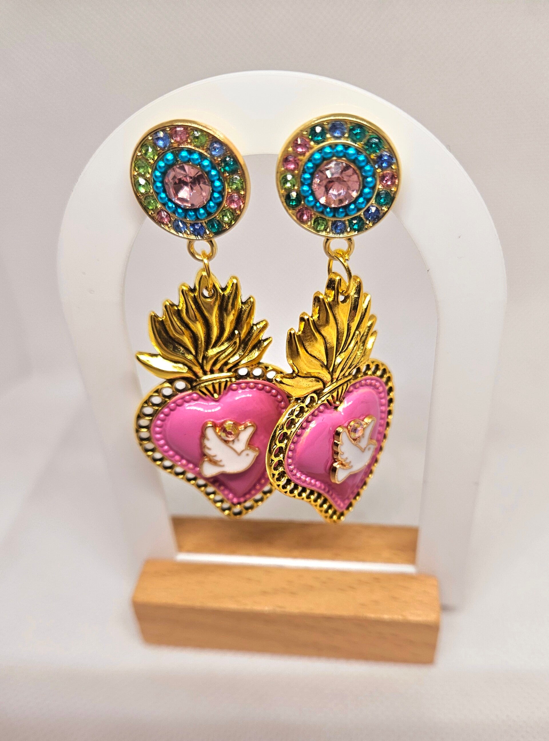 Boucles d' oreilles Colombe ExVotoByNaGap, retrouvez cette très belle paire de BO ravissante avec son Ex Voto peint main et sa petite Colombe strassée, le cabochon aux teintes très douces apporte une touche so girly, création originale entièrement réalisée à la main dans mon atelier près de Roussillon.
