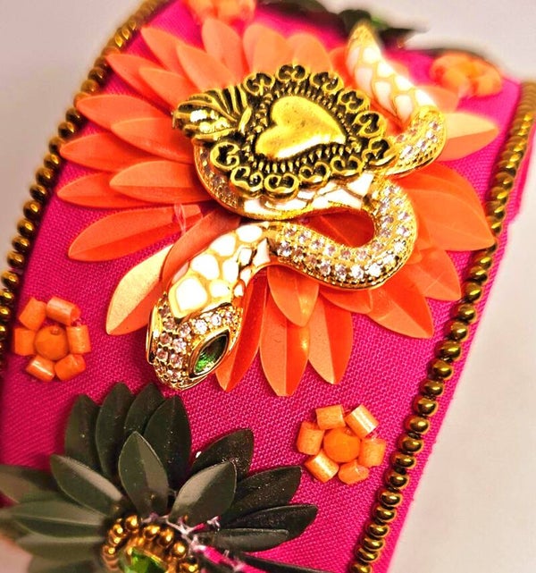 Le bracelet "Étreinte de Serpent" allie mystère et sophistication. Avec ses motifs floraux dorés et son serpent scintillant, il représente une union parfaite entre la force et la beauté. Ce bijou audacieux en noir et or attire l’œil et sublime votre poignet, ajoutant une touche d'élégance à toutes vos tenues.