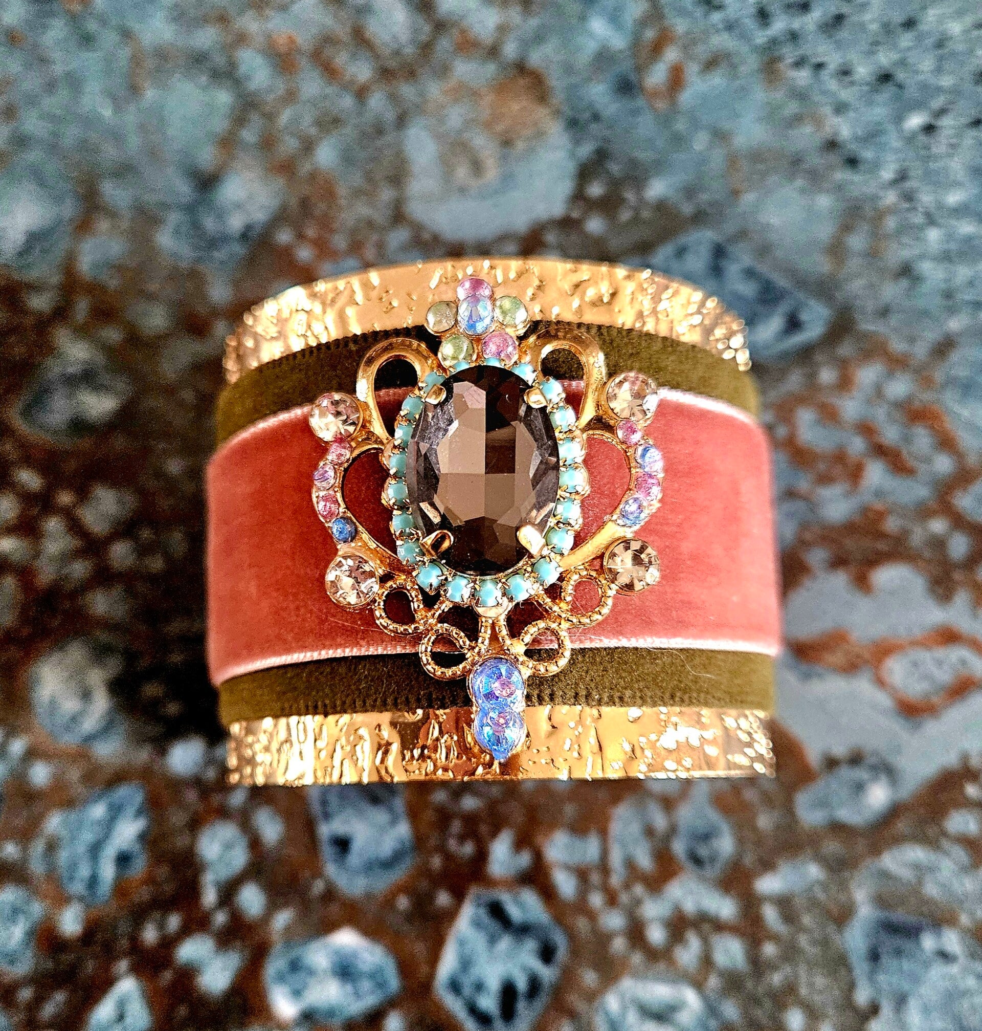Résolument baroque , ma toute dernière création aborde les couleurs de la rentrée, rose poudré, kaki , travaillée avec du velours cette manchette est une pièce unique très lumineuse avec son cabochon en cristal de synthèse orné de pierres turquoises, un très beau contraste.