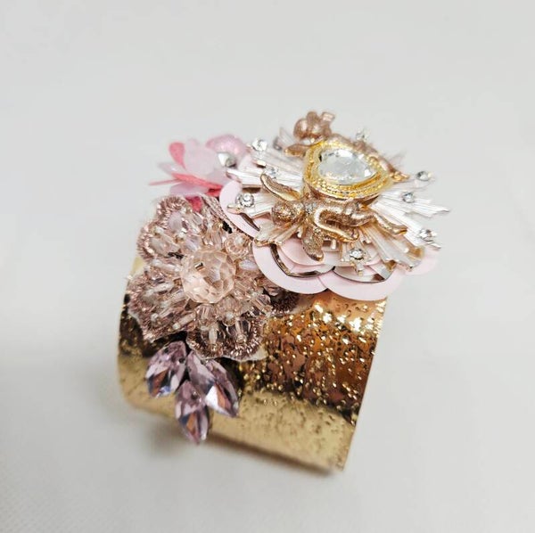 🌸 Des fleurs délicates, serties de cristaux et de perles rosées, rappellent la grâce des jardins célestes.