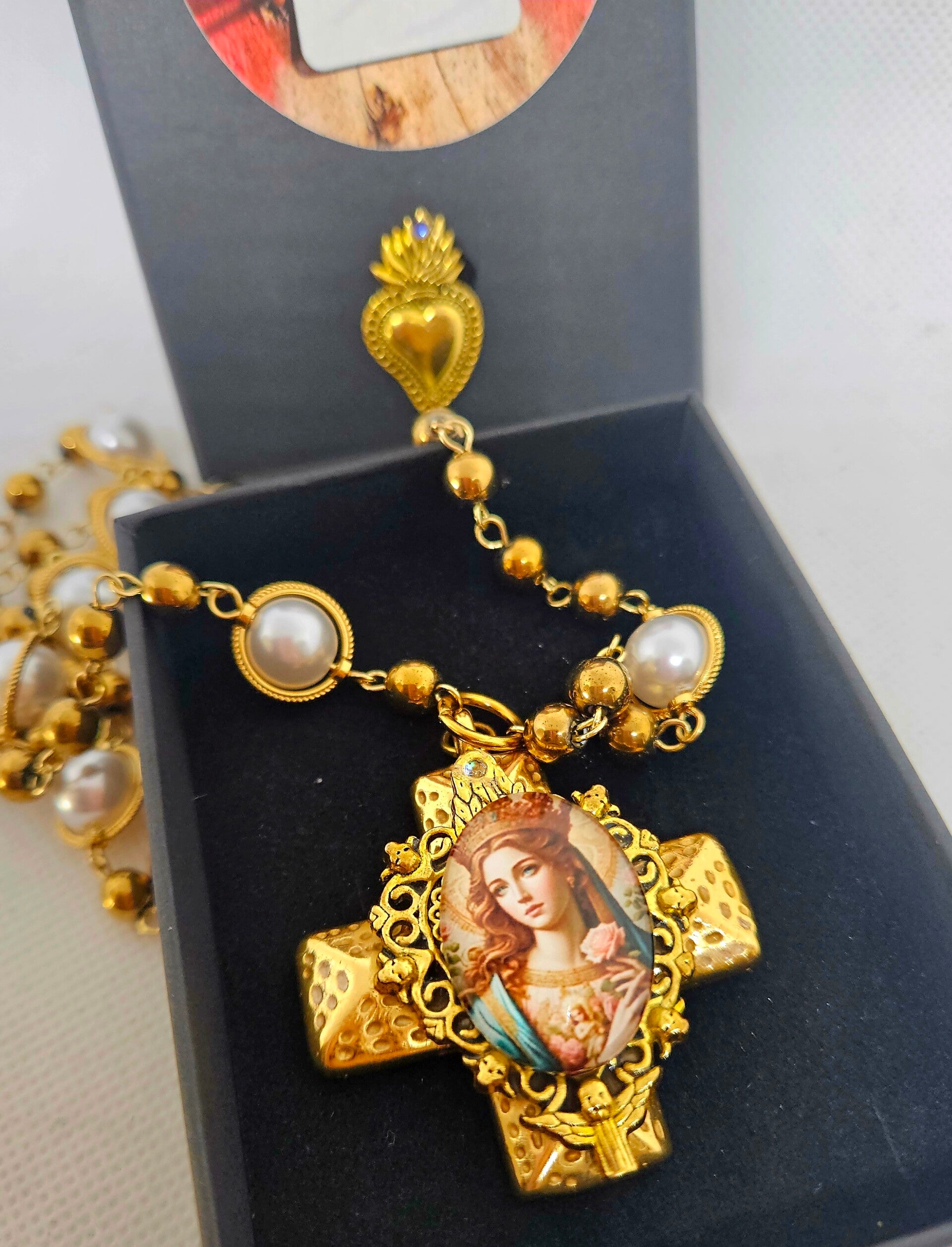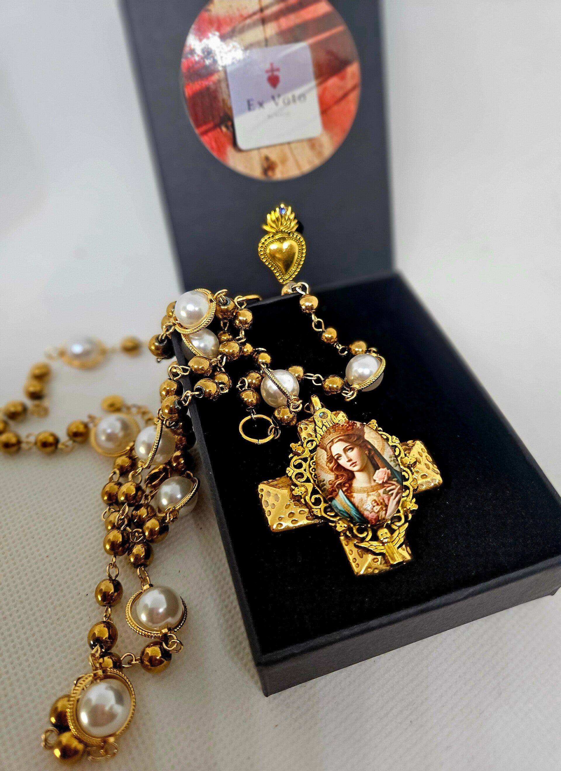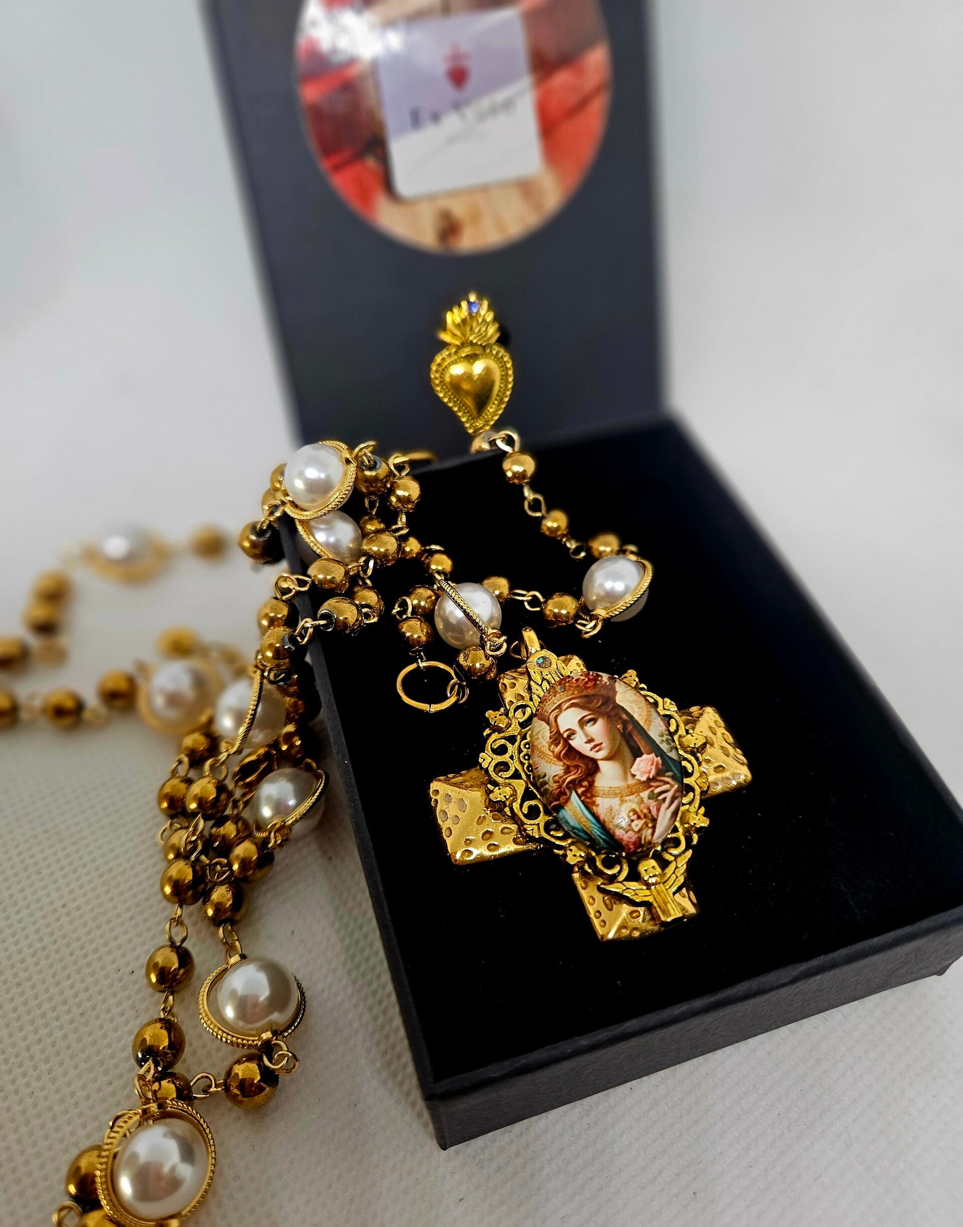 Ce sautoir somptueux unit la pureté des perles à la noblesse du doré, sublimé par un médaillon délicatement orné d’une figure sacrée. Chaque détail, du cœur flamboyant à la croix finement ciselée, évoque la dévotion, la lumière et la grâce intemporelle.