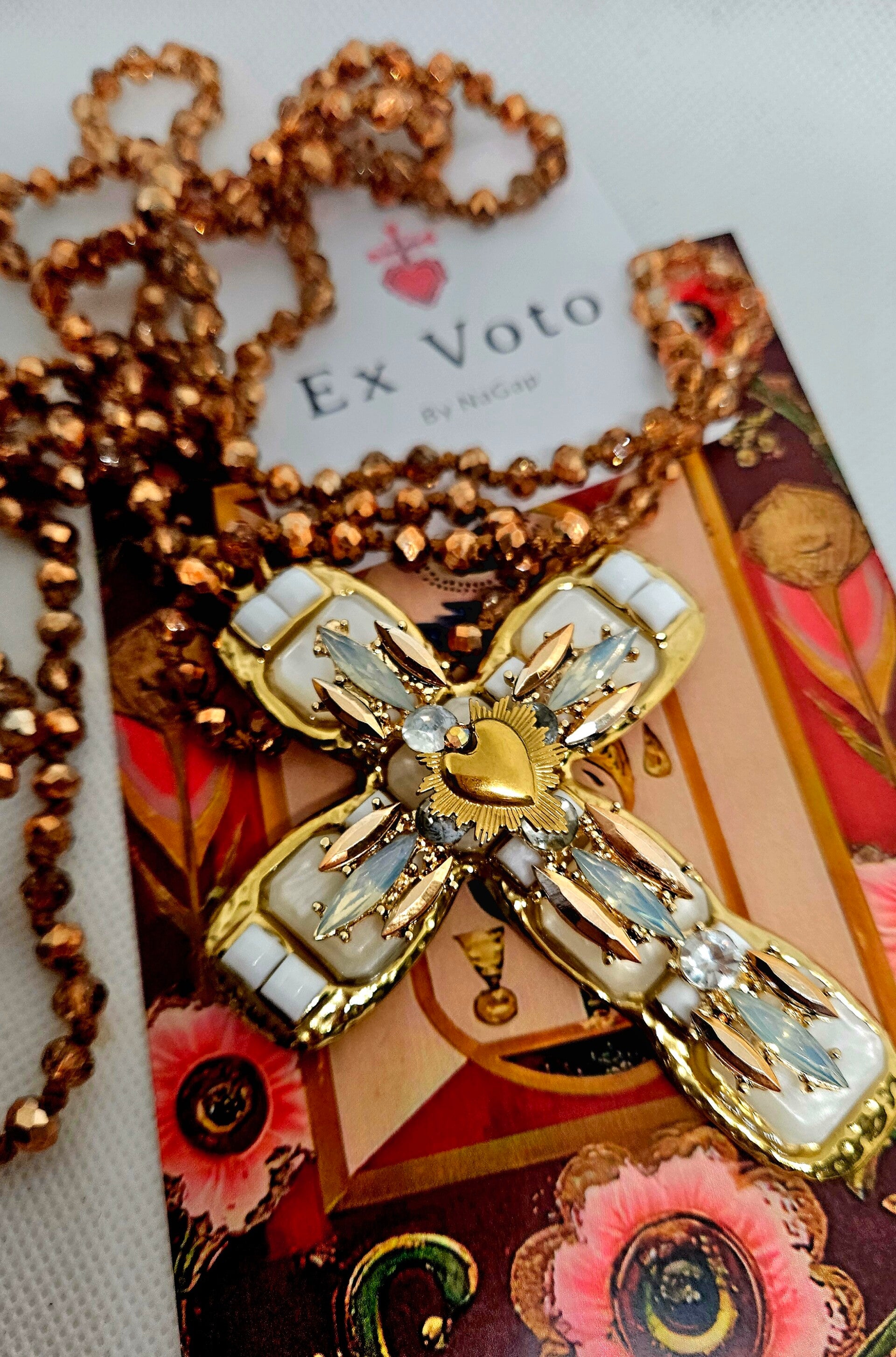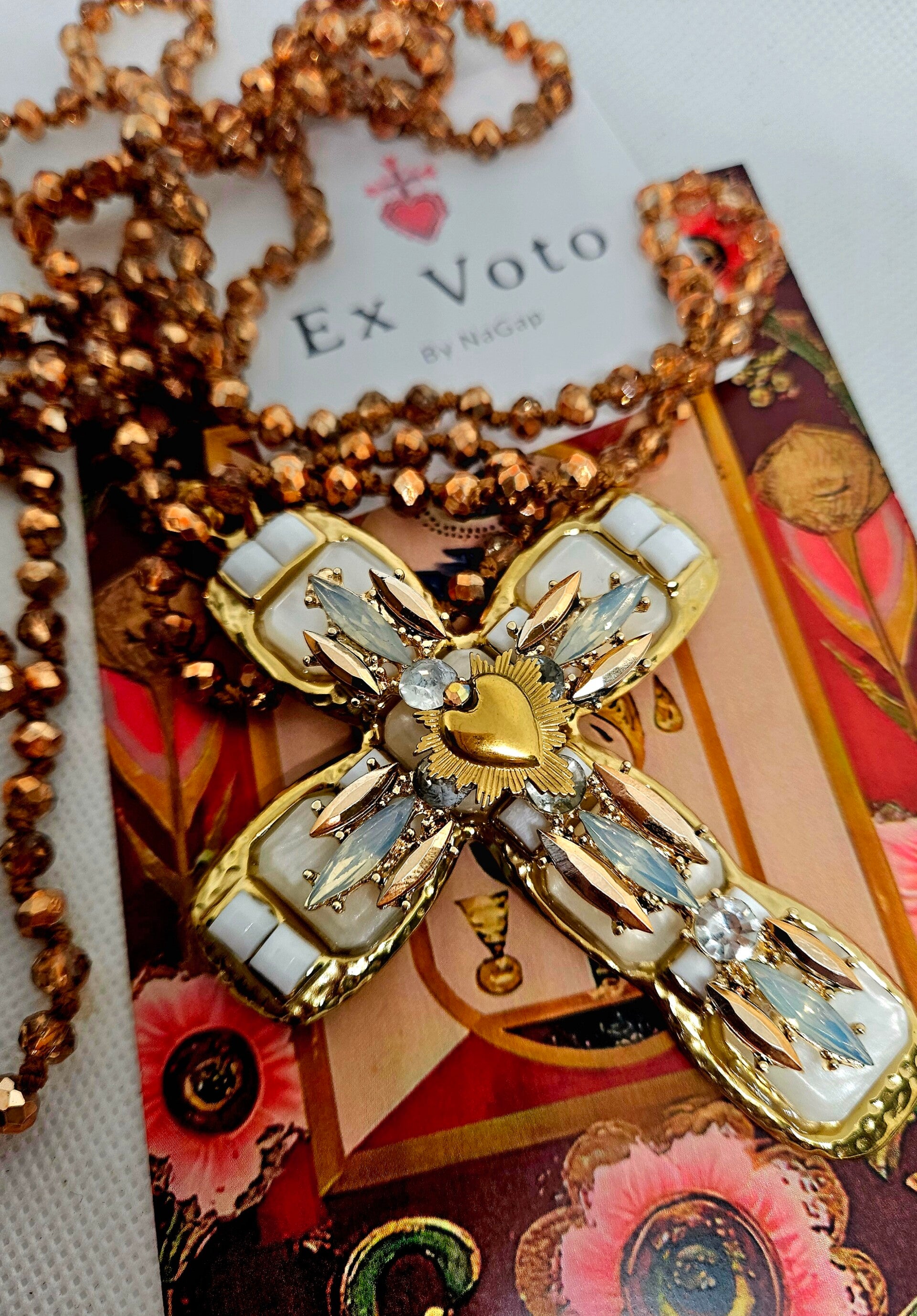 Sa croix majestueuse, ornée d’un cœur doré flamboyant, de nacre irisée et de cristaux étincelants, évoque les trésors d’un autel baroque et la chaleur d’une prière murmurée.