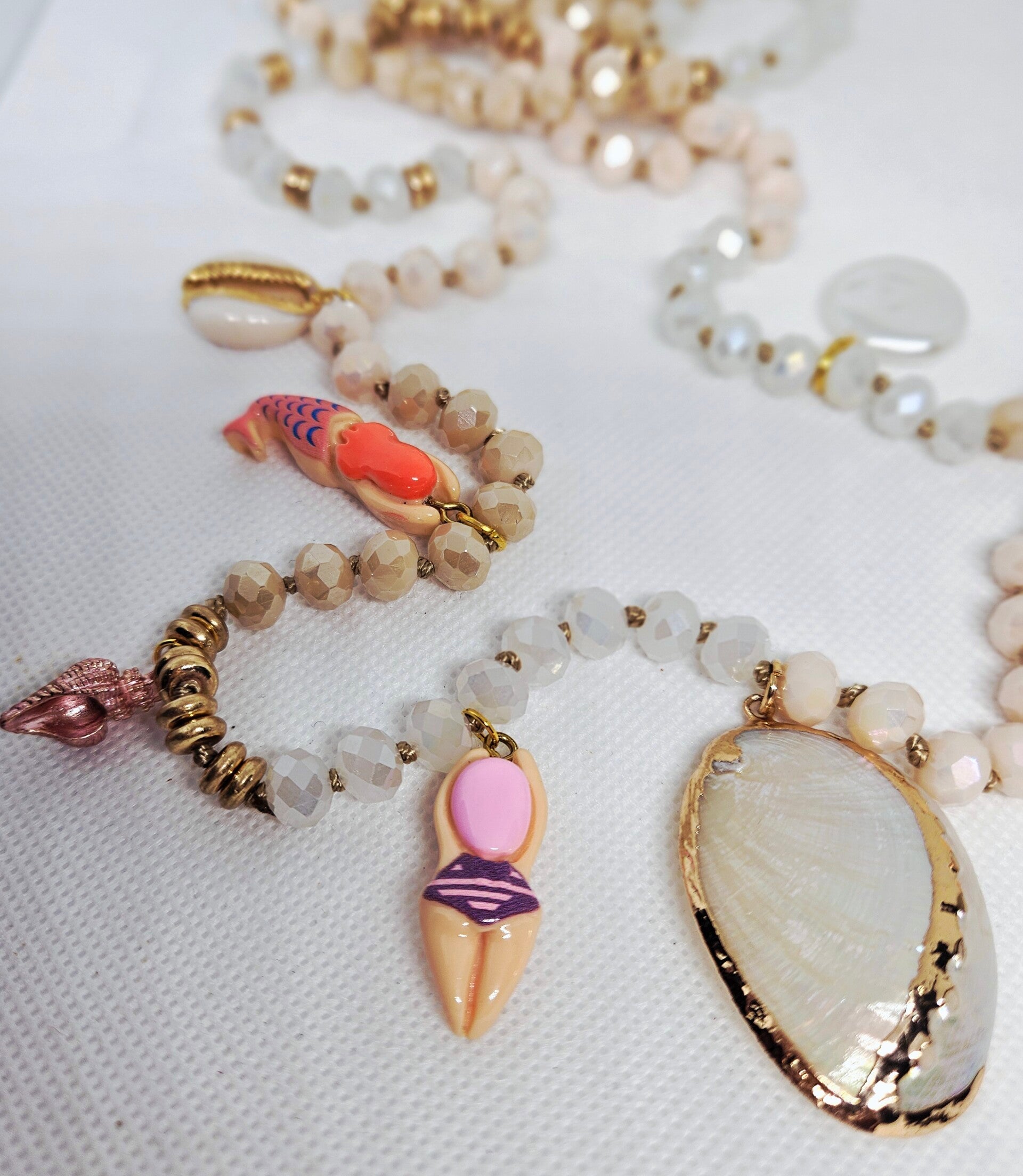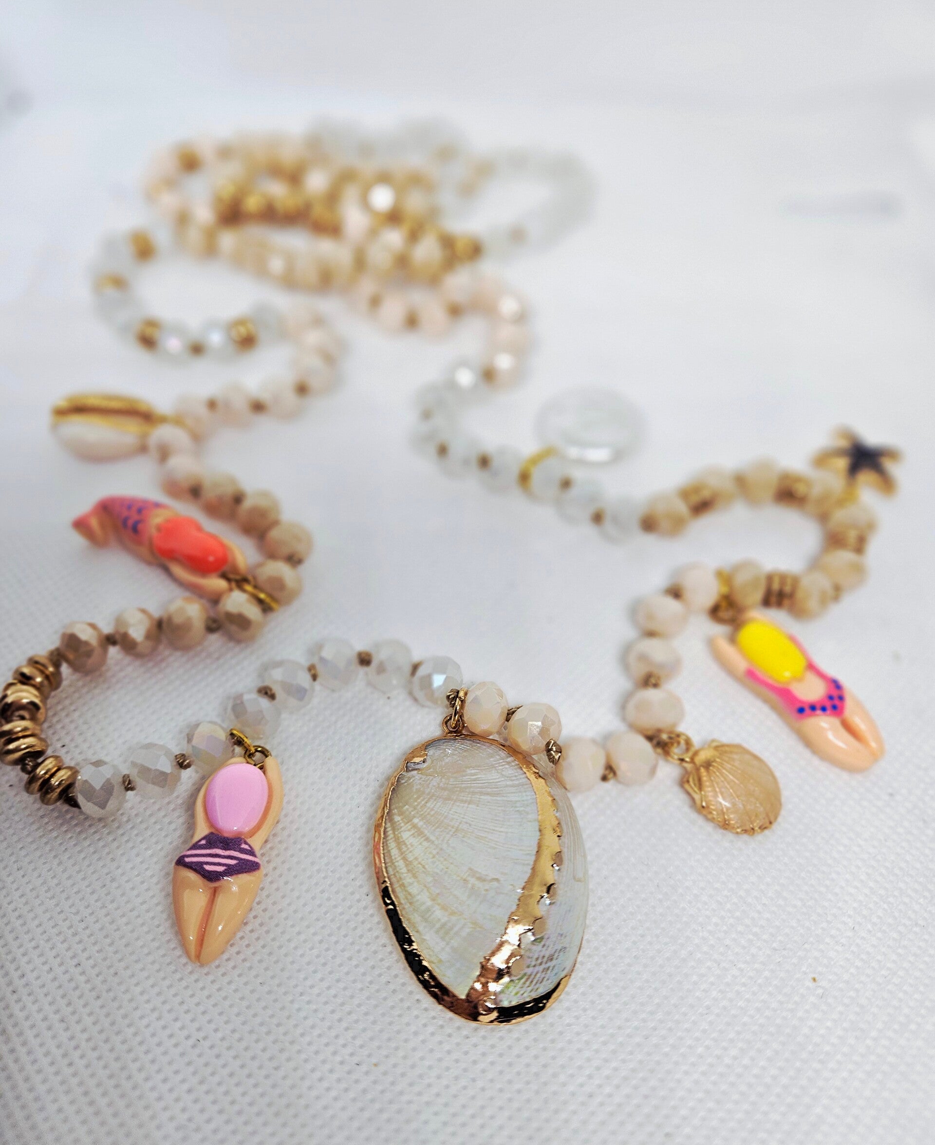 Perles nacrées, coquillages dorés, breloques colorées et éclats marins se mêlent dans une harmonie délicate. Chaque pendentif raconte une histoire : celle des vagues, du sable chaud et des baignades éternelles.