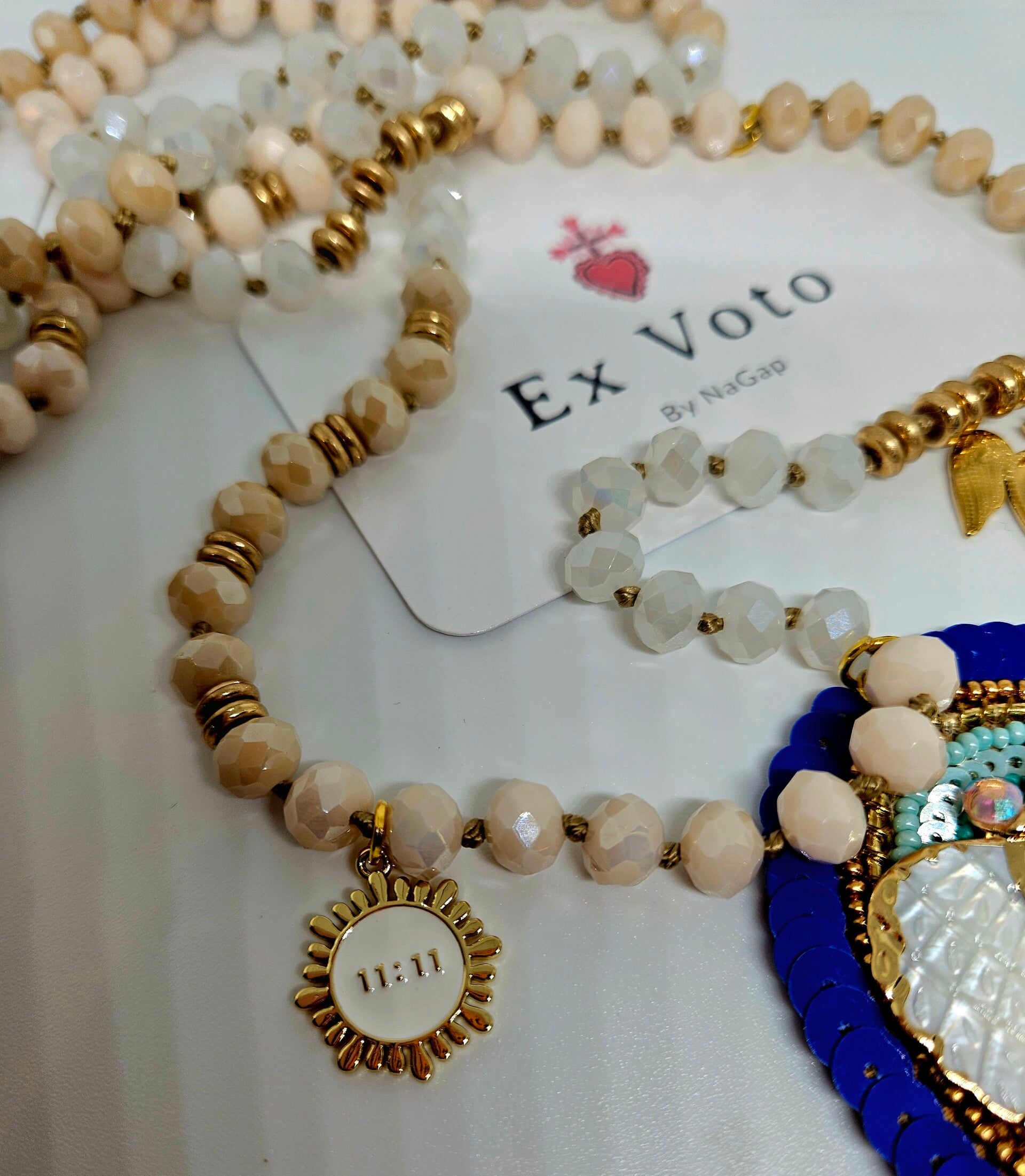 Le sautoir Les Heures Miroirs d’ExVotoByNaGap capture l’instant où le visible et l’invisible se rencontrent. Chaque perle, chaque éclat doré, chaque nuance céleste évoque ces moments suspendus où l’univers semble murmurer un message secret.