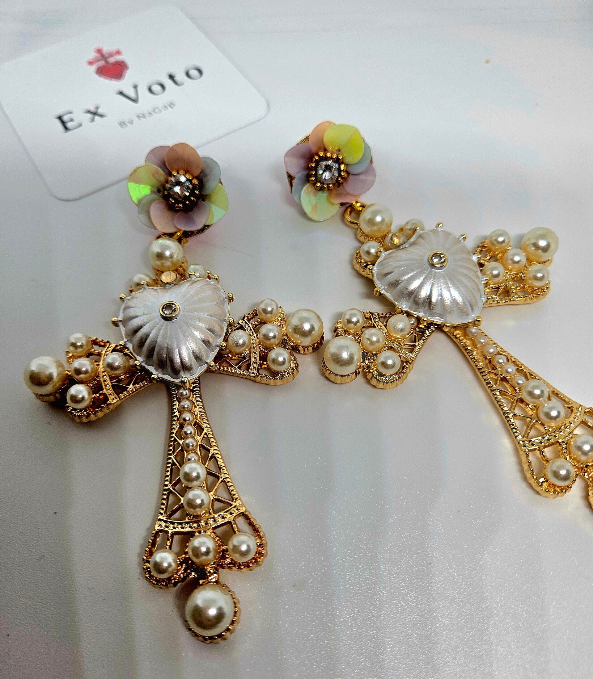 Sculptées comme des reliques précieuses, elles mêlent la délicatesse des perles nacrées à la puissance symbolique de la croix dorée. En leur centre, un cœur argenté rayonne, rappel d’amour et de lumière intérieure.