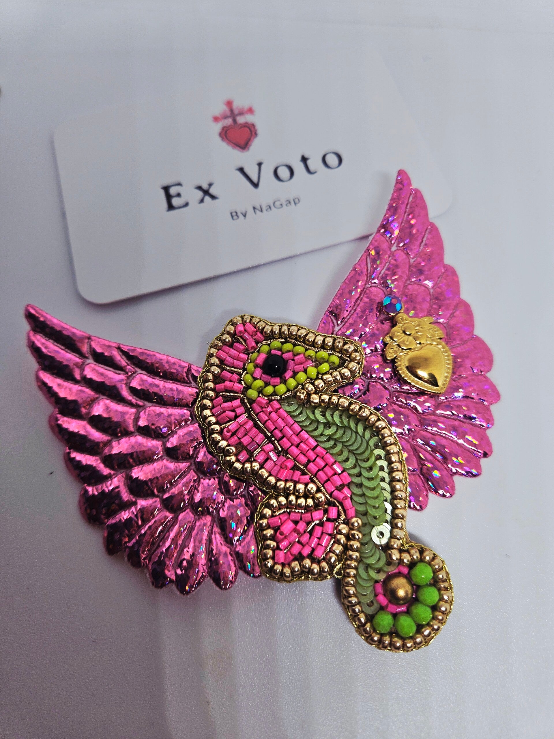 Entre pop art et art sacré, ce petit hippopotame ailé explose les codes avec ses ailes fuchsia pailletées, ses perles acidulées et son cœur doré flamboyant. L'oiseau et les homards sont tout autant surprenants.