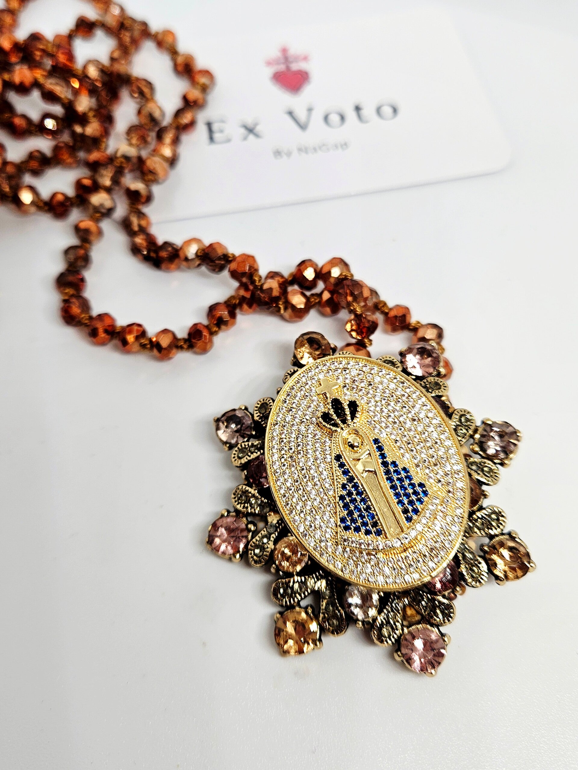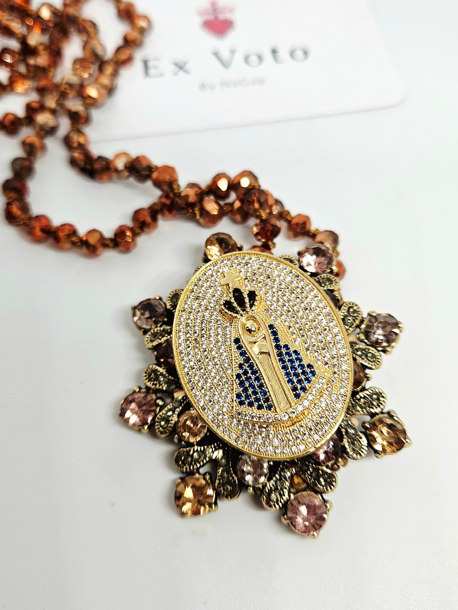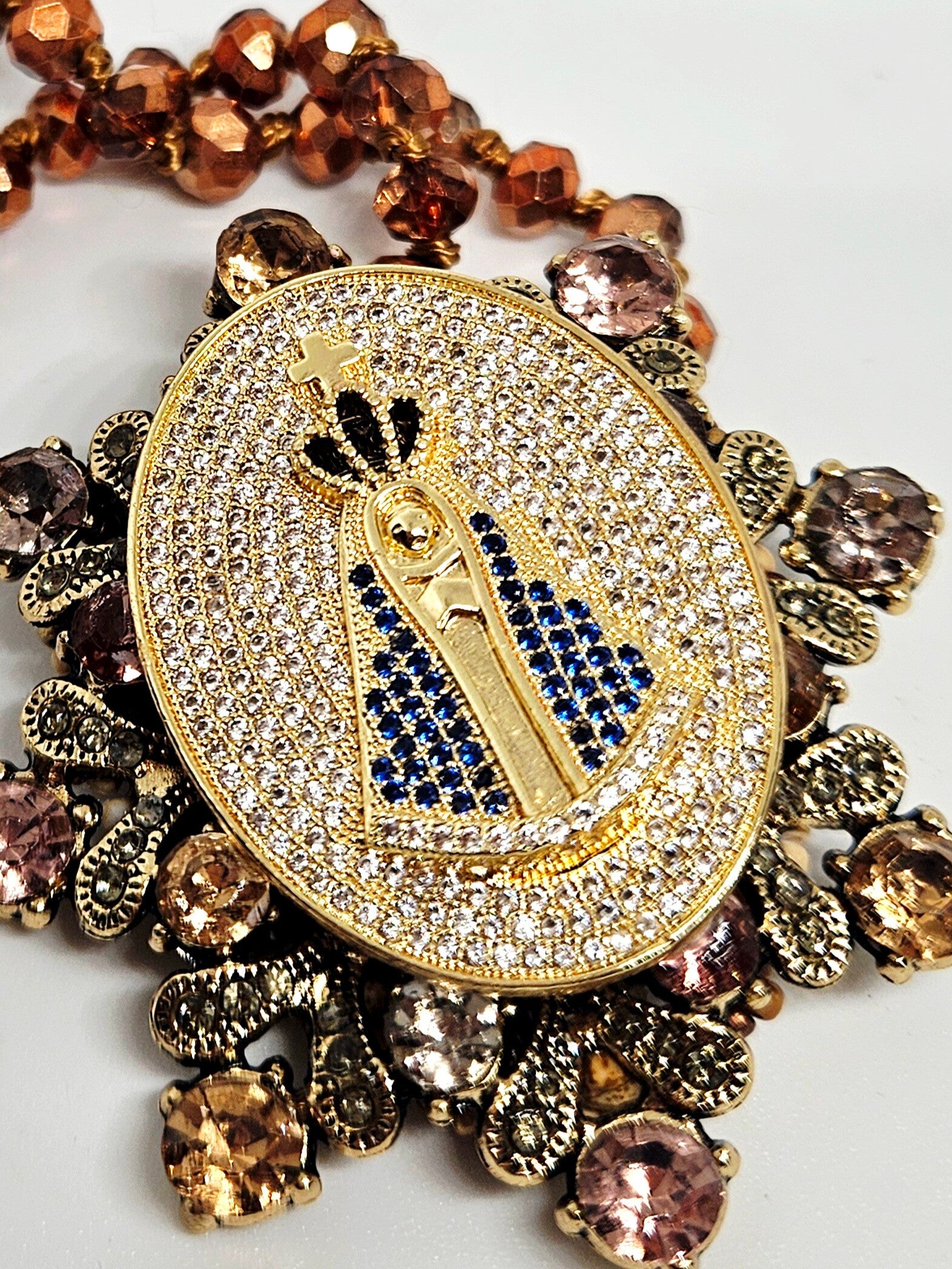 Son médaillon doré, orné d’une silhouette sacrée sertie de cristaux étincelants, rayonne comme une prière de lumière.