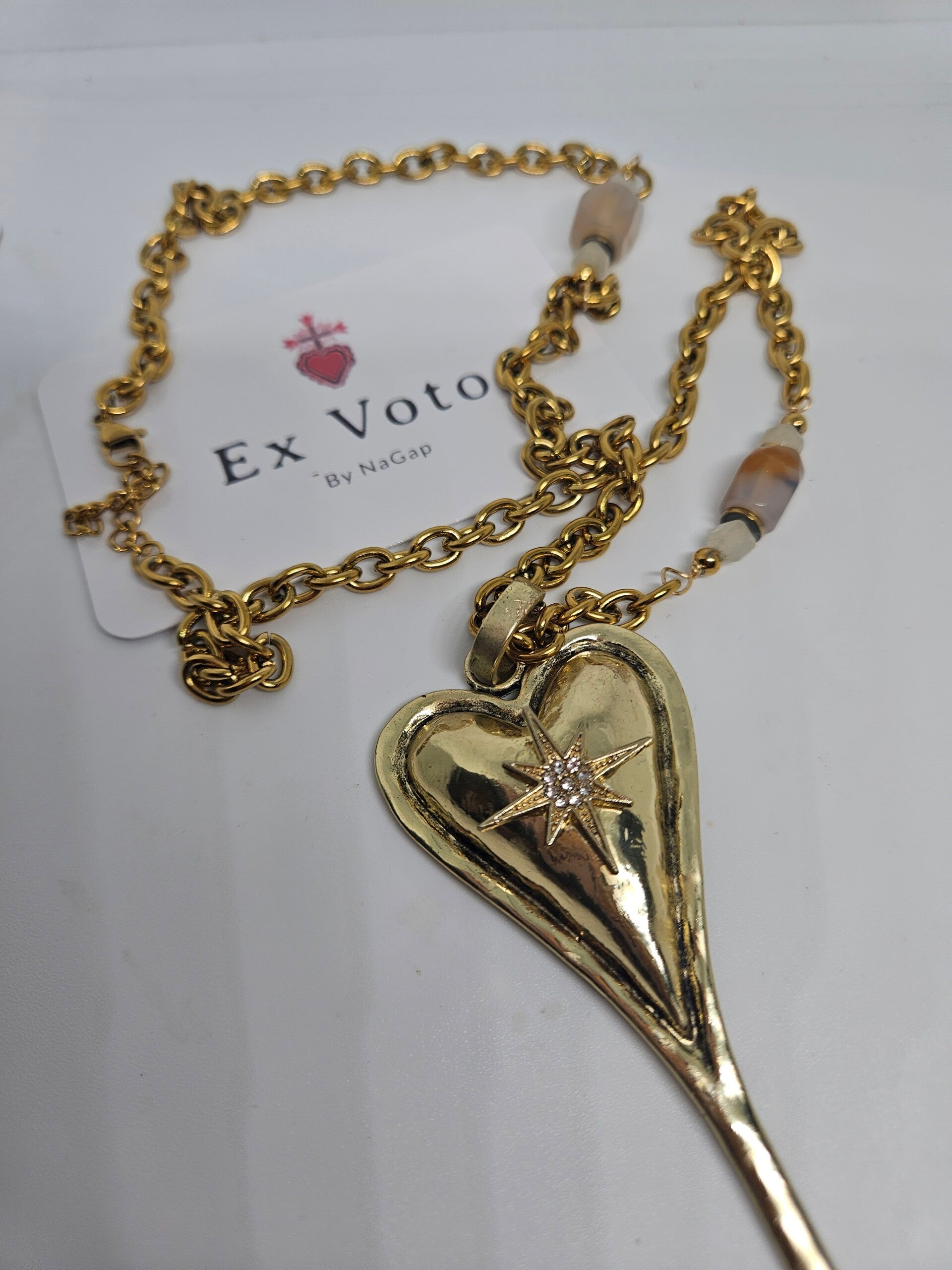 Le collier Cœur Stellaire d’ExVotoByNaGap incarne la rencontre entre la passion et la lumière. Son pendentif en forme de cœur allongé, doré à l’or chaud, est orné d’une étoile scintillante, symbole d’espoir et de guidance intérieure.