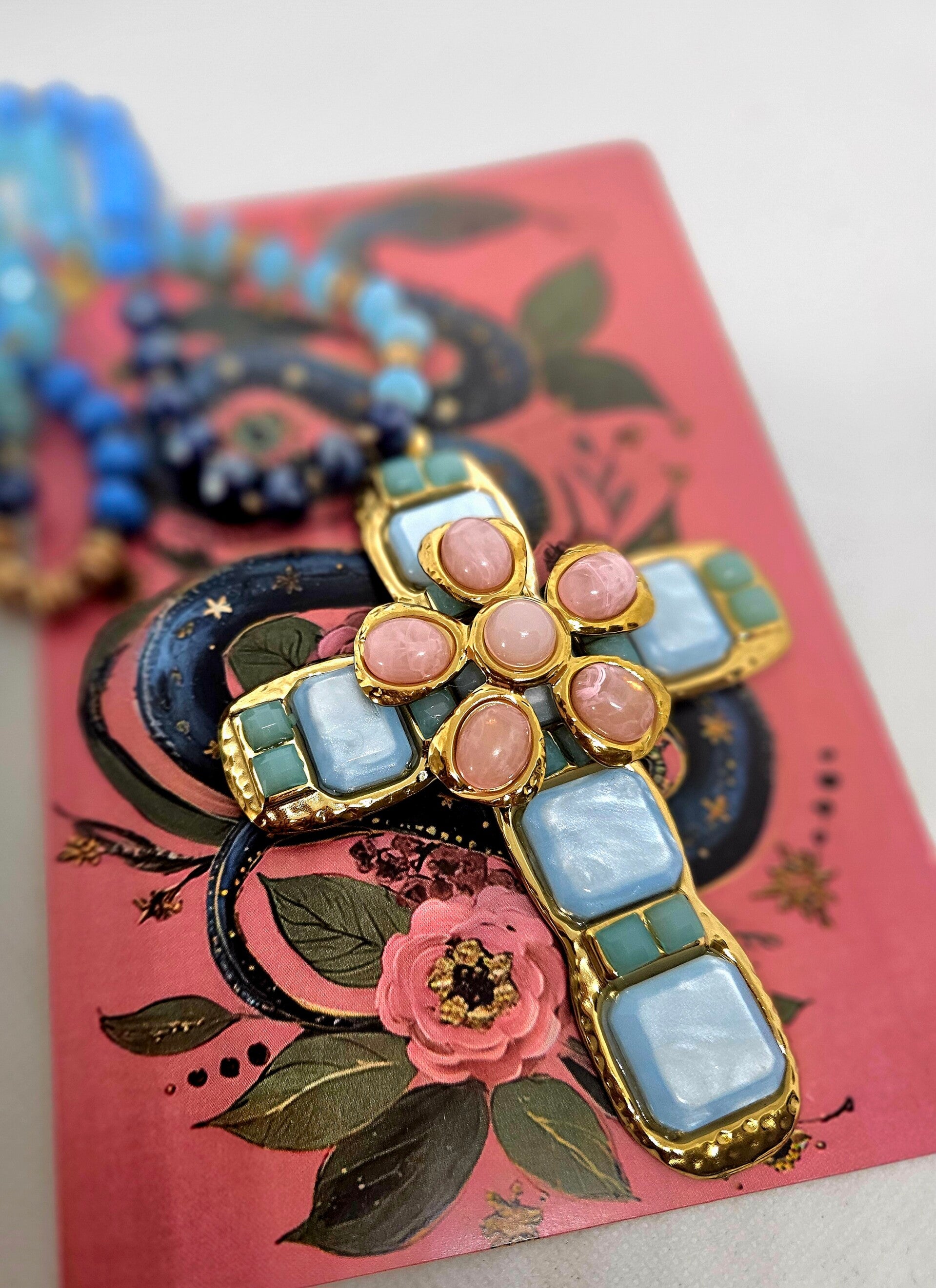 Symbole de lumière et d’horizon, Croix des Mers évoque la douceur des vagues et la profondeur des océans. Ce sautoir unique marie l’éclat du doré à la sérénité des pierres bleu azur et aux reflets tendres du rose corail.