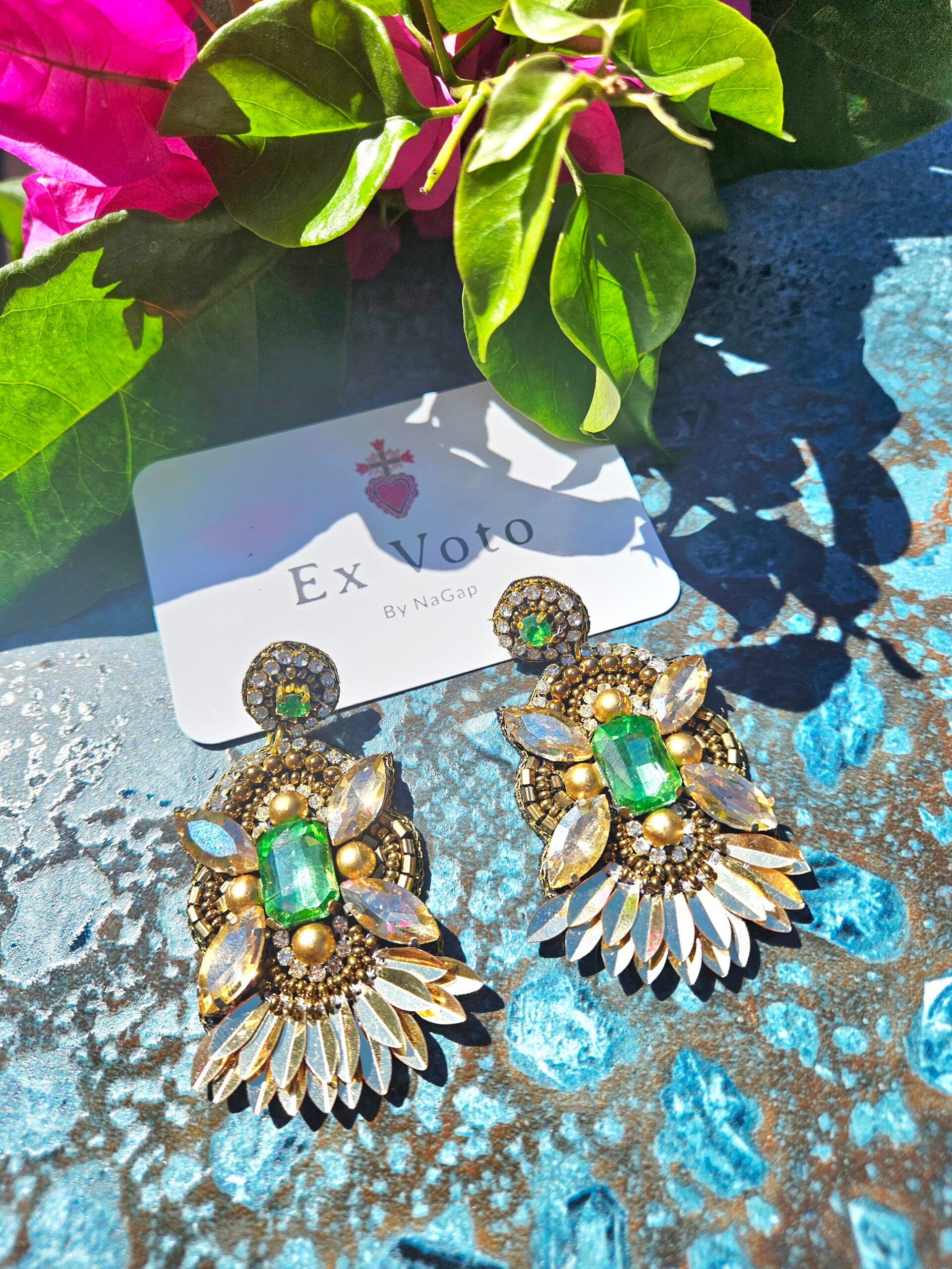 Inspirées par la symbolique des ex-voto, ces boucles incarnent la gratitude et la renaissance. Le vert olivine, pierre du renouveau, capte la lumière du cœur, tandis que les pétales dorés s’ouvrent comme une offrande solaire.