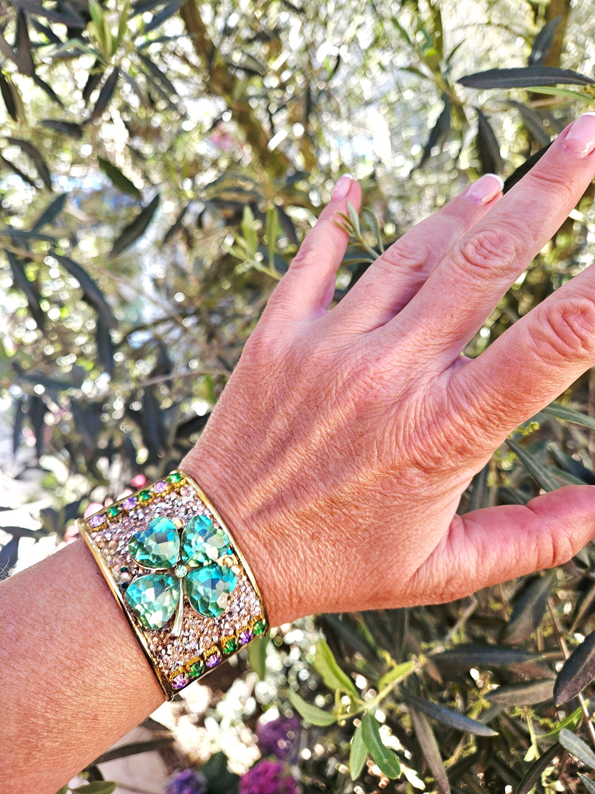 ✨ L'Élégance Dorée Un bracelet manchette en métal doré sublimé par une constellation de cristaux scintillants et de pierres multicolores qui captent la lumière à chaque mouvement.