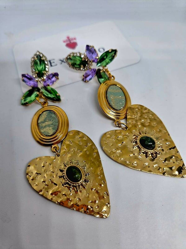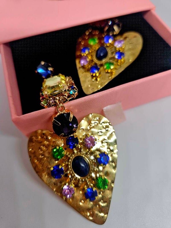 Chaque paire est une véritable œuvre d'art : des cristaux colorés délicatement sertis en couronne, un médaillon ovale raffiné, et un cœur doré martelé à la main qui capture la lumière à chaque mouvement.