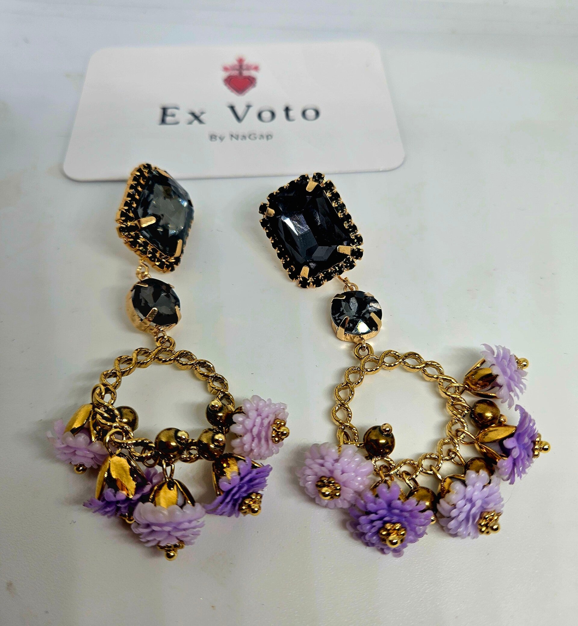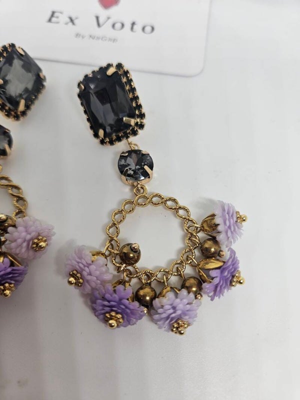Les boucles d'oreilles Jardin Secret sont une célébration de la féminité : des cristaux noirs profonds sublimés par des montures dorées, suivis de délicates créoles ornées de fleurs violettes et perles dorées qui dansent à chaque mouvement.