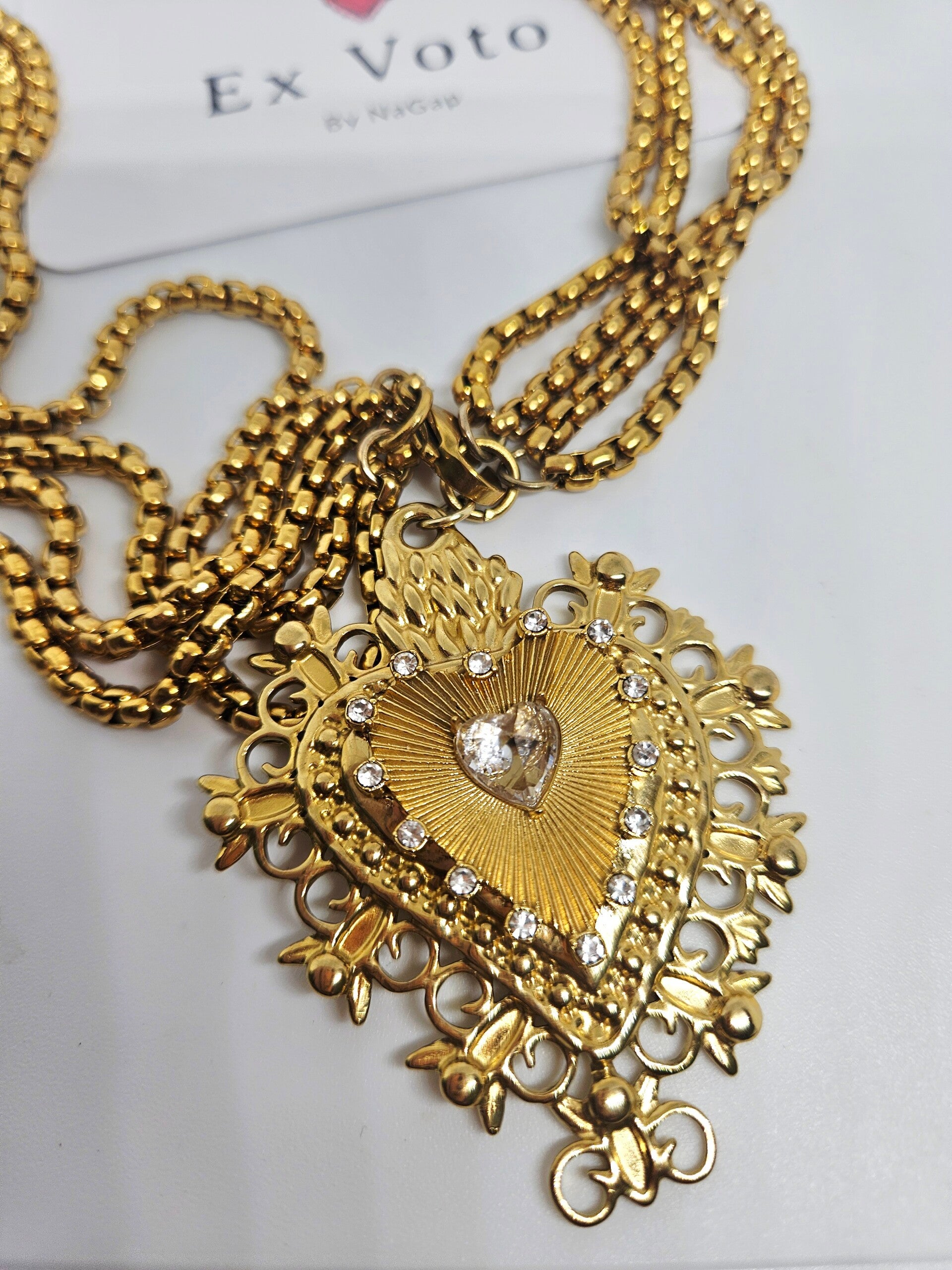 Au cœur de ce bijou d'exception : un pendentif monumental en or finement ciselé, orné d'un cœur rayonnant serti de cristaux scintillants. Chaque détail évoque les ex-voto des églises baroques, ces offrandes précieuses chargées de dévotion et d'émotion.