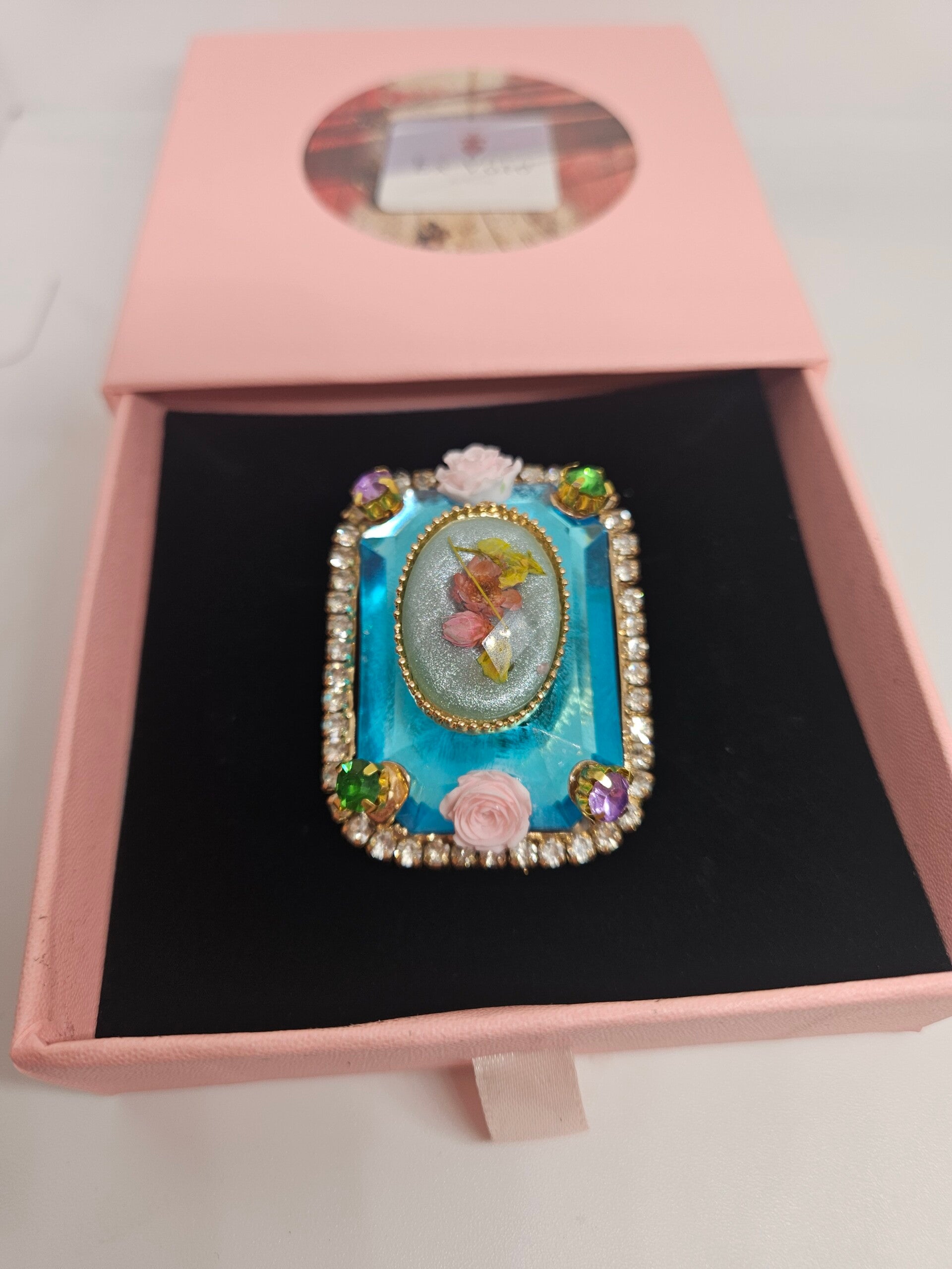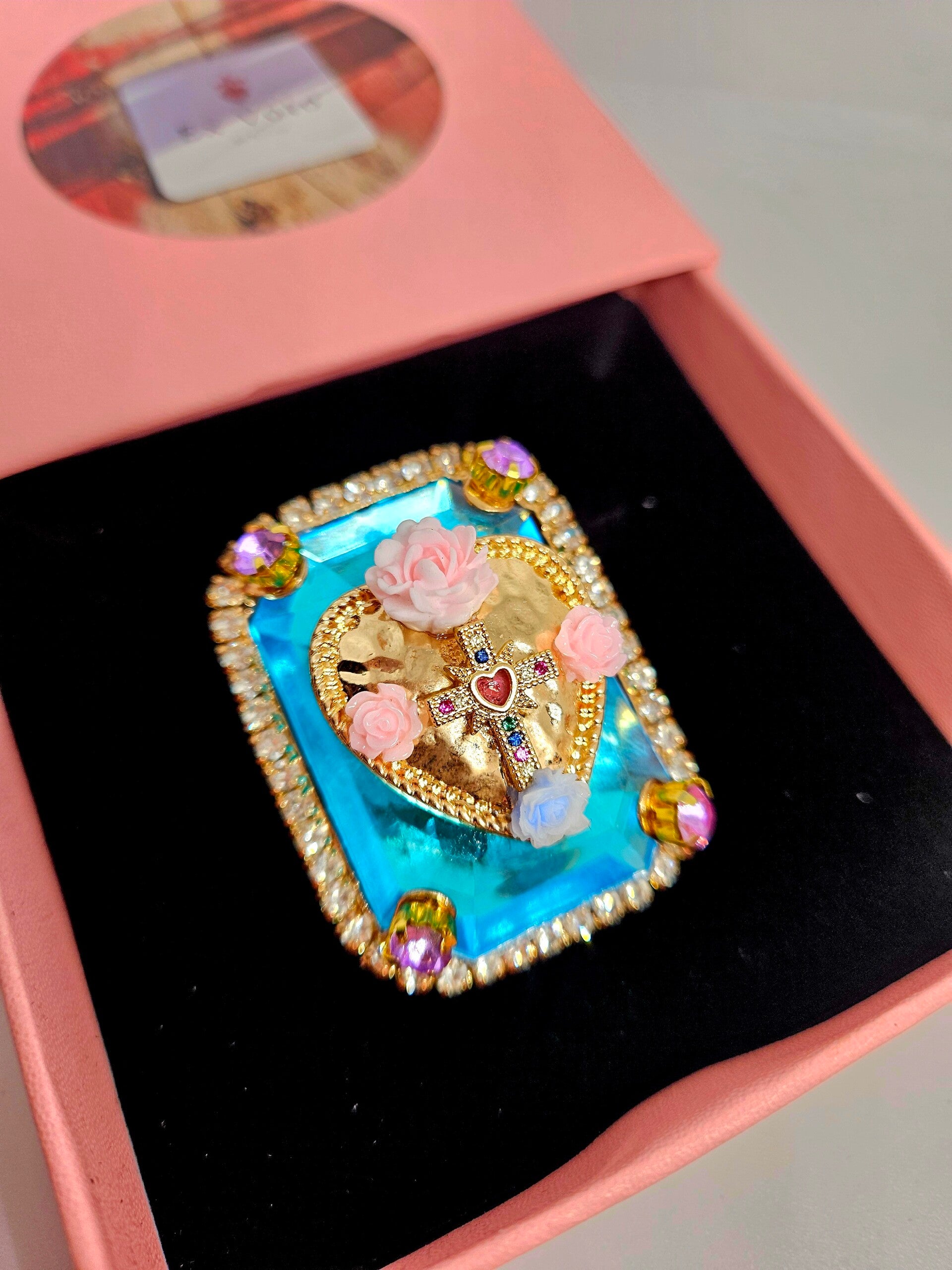 La broche La Mariée est une véritable œuvre d'art : un écrin de résine turquoise translucide enchâssé dans un cadre de perles nacrées, révélant en son cœur un voile de mariée en feuille d'or délicatement travaillé. Une croix sertie de cristaux multicolores trône au centre, entourée de roses en résine rose poudré et de pierres précieuses aux reflets violets et verts.