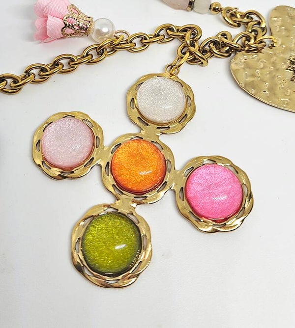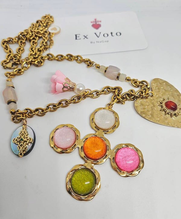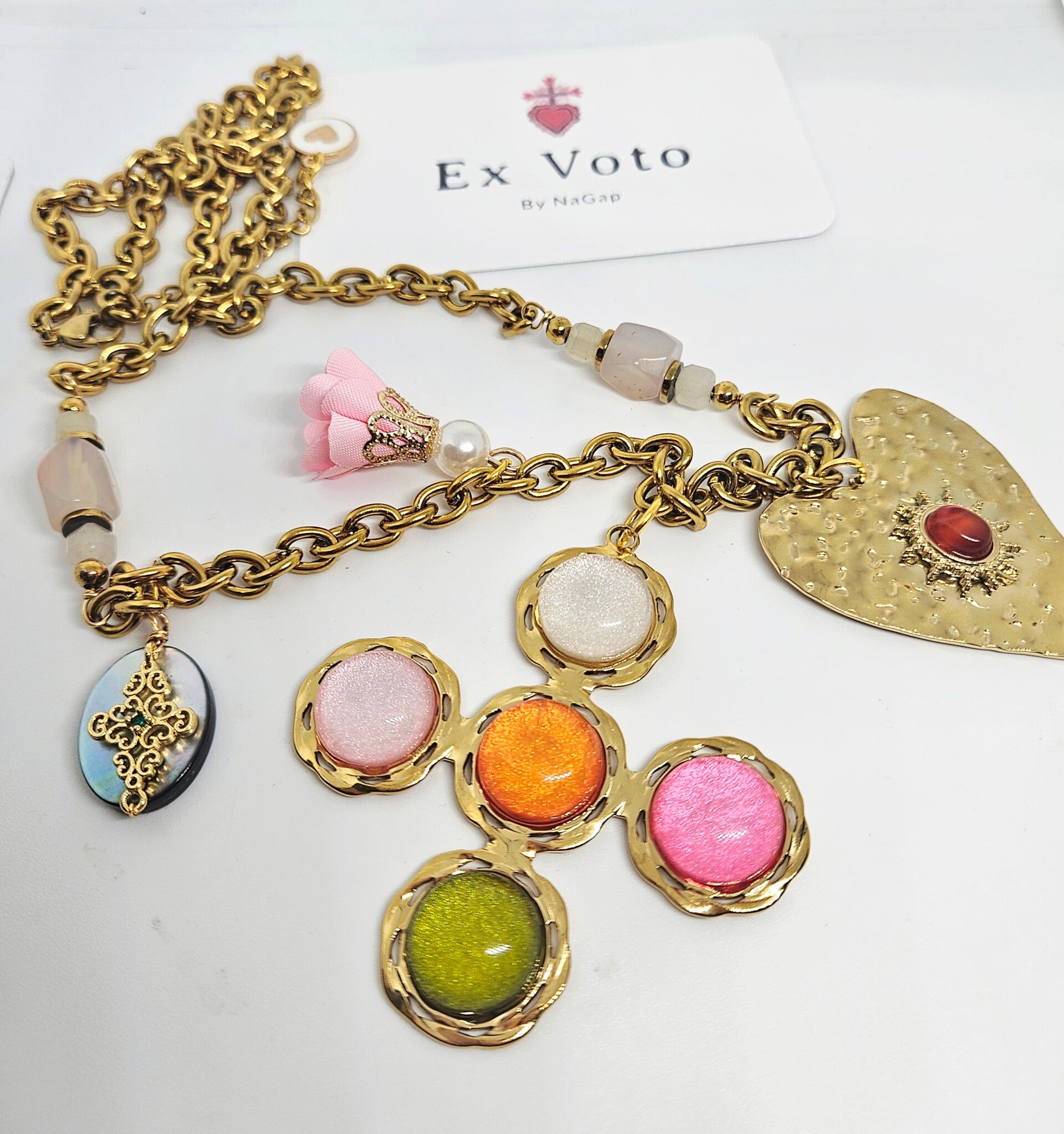 Jardin d'Offrandes est une composition poétique où chaque élément raconte une histoire : une chaîne dorée généreuse ornée de breloques précieuses – médaillons émaillés aux teintes vibrantes (rose poudré, orange solaire, fuchsia éclatant, vert olive et blanc nacré), un cœur doré martelé serti d'une cornaline flamboyante, une croix baroque sur émail bleu ciel, des perles de quartz rose et une délicate fleur de soie rose.